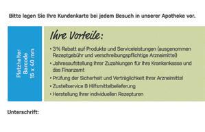 Als Inhaber einer Kundenkarte kaufen Sie günstiger ein! Außerdem können wir Sie so noch besser zu möglichen Wechselwirkungen Ihrer Medikamente beraten. Am Jahresende erhalten Sie auf Wunsch eine Auflistung Ihrer Zuzahlungen. Füllen Sie gleich Ihren Kundenkartenantrag in der Apotheke aus!