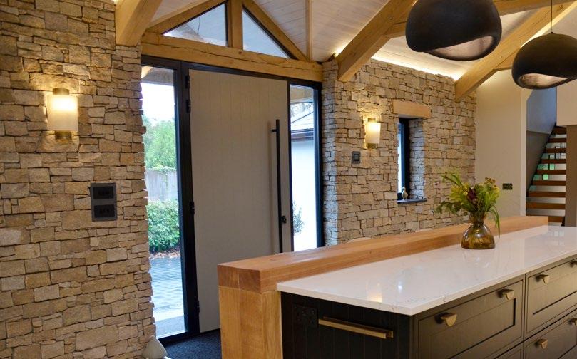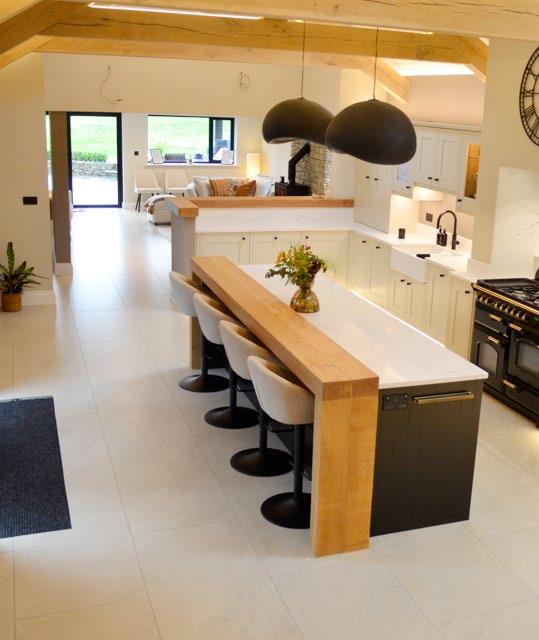 The Furses selected a Burbidge Chartwell kitchen in Putty, complemented by oak shelving and a bespoke black island for contrast. A Luna Linear brass pull handle was used on the island to create a bold statement. silestone worktops, sourced from Mayflower Stone, were chosen for durability and elegance. To achieve the high-end look of an in-frame kitchen without exceeding their budget, we used a false in-frame construction, providing a luxury aesthetic while remaining costeffective. The kitchen was designed to balance practicality and visual appeal, ensuring longevity.