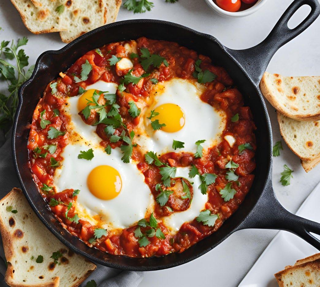 Use the back of a spoon or a ladle to make four wells in the sauce, then crack an egg into each. Cover with a lid and cook gently for 3–4 minutes until the whites are set and yolks are still runny.