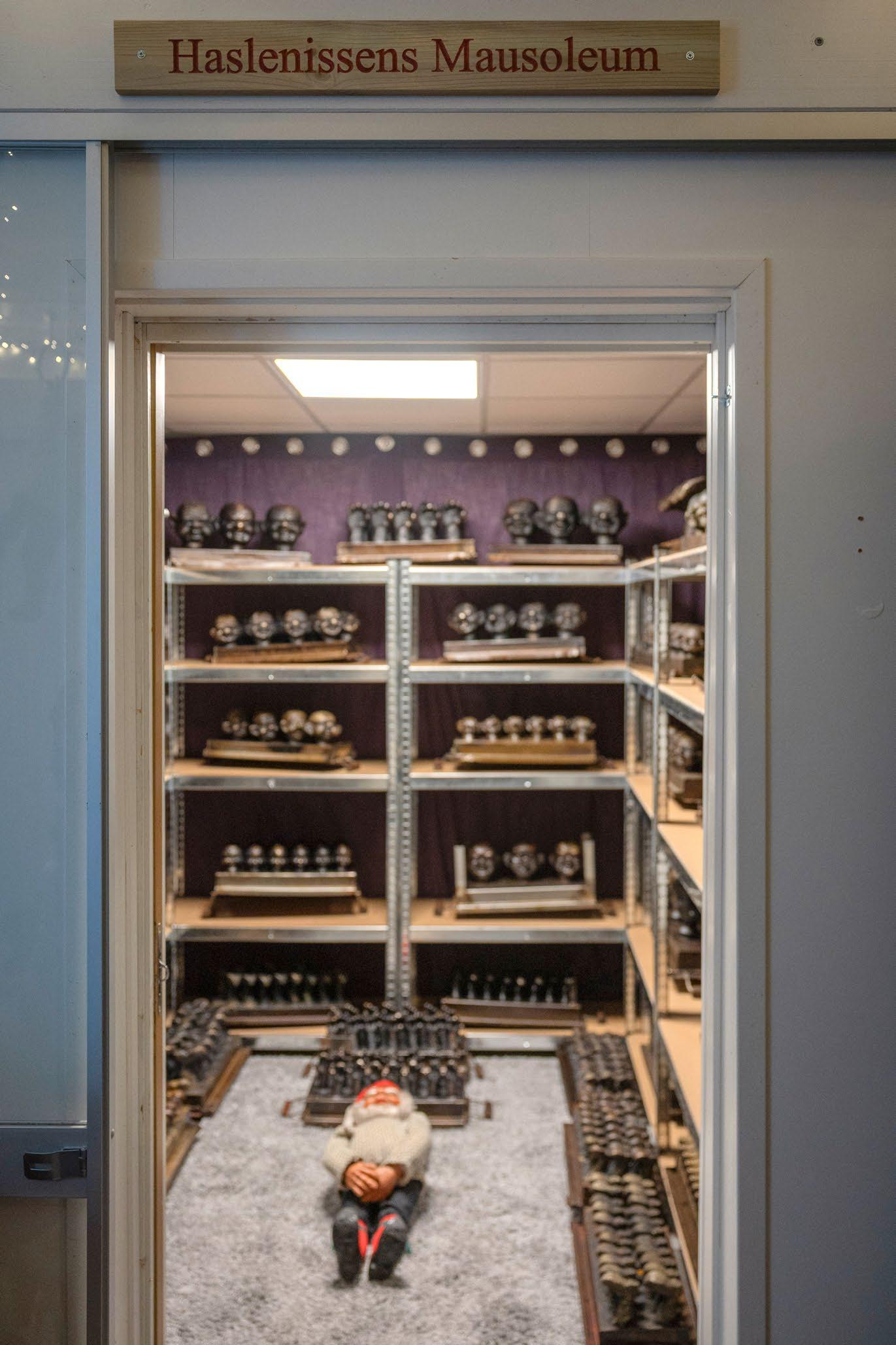 I den ene enden av lokalet er det et innglasset rom med skiltet «Haslenissens mausoleum» over. Der alle Haslenissenes originale støpeformer ligger.