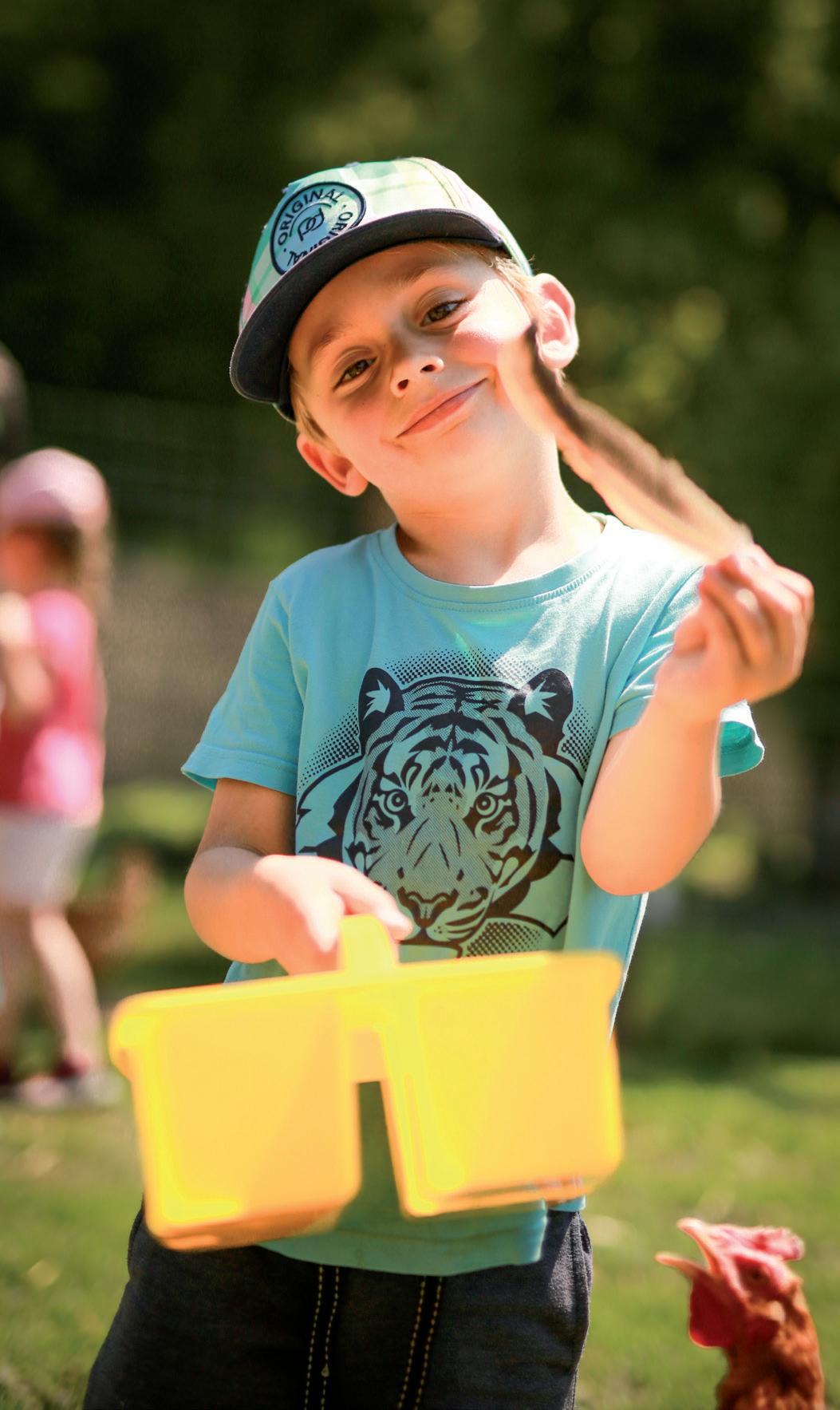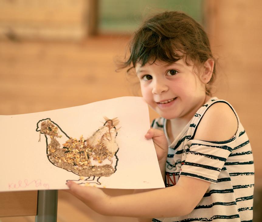Les élèves expérimentent leurs sens en récoltant herbe, fleurs, paille et graines dans l’enclos des poules.