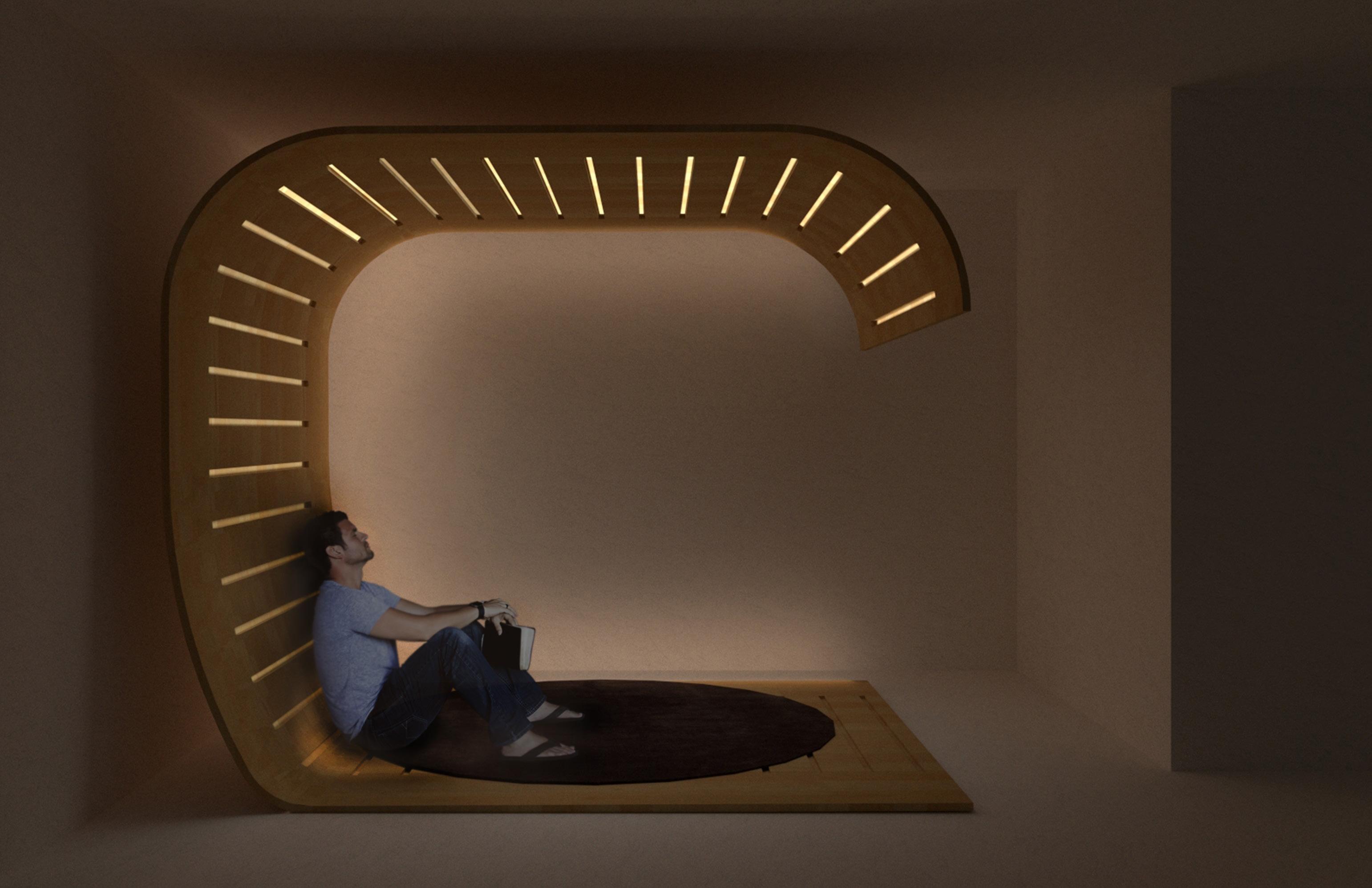 Whether it be a prayer mat, a meditation rug, or simply a carpet in your bedroom, this extra surface defines a space that transcends the common experience. It provides opportunities for a connection to a higher being, the deepening of conscious awareness, or genuine comfort. Borrowed from a vocabulary that simultaneously has sacred connotations and is familiar to us in everyday life, our design of a reflection space seeks to show respect to all religious practices, enrich spiritual experience and allow a moment of solitary refuge from the business and anxiety of everyday life.