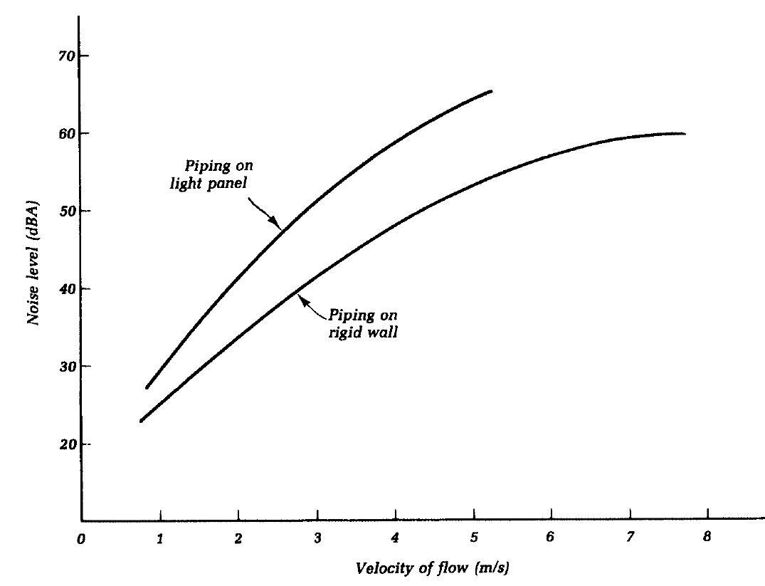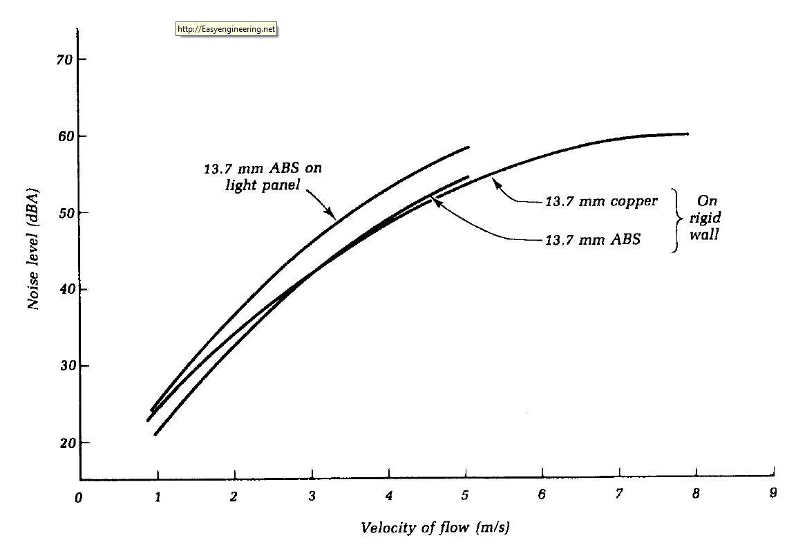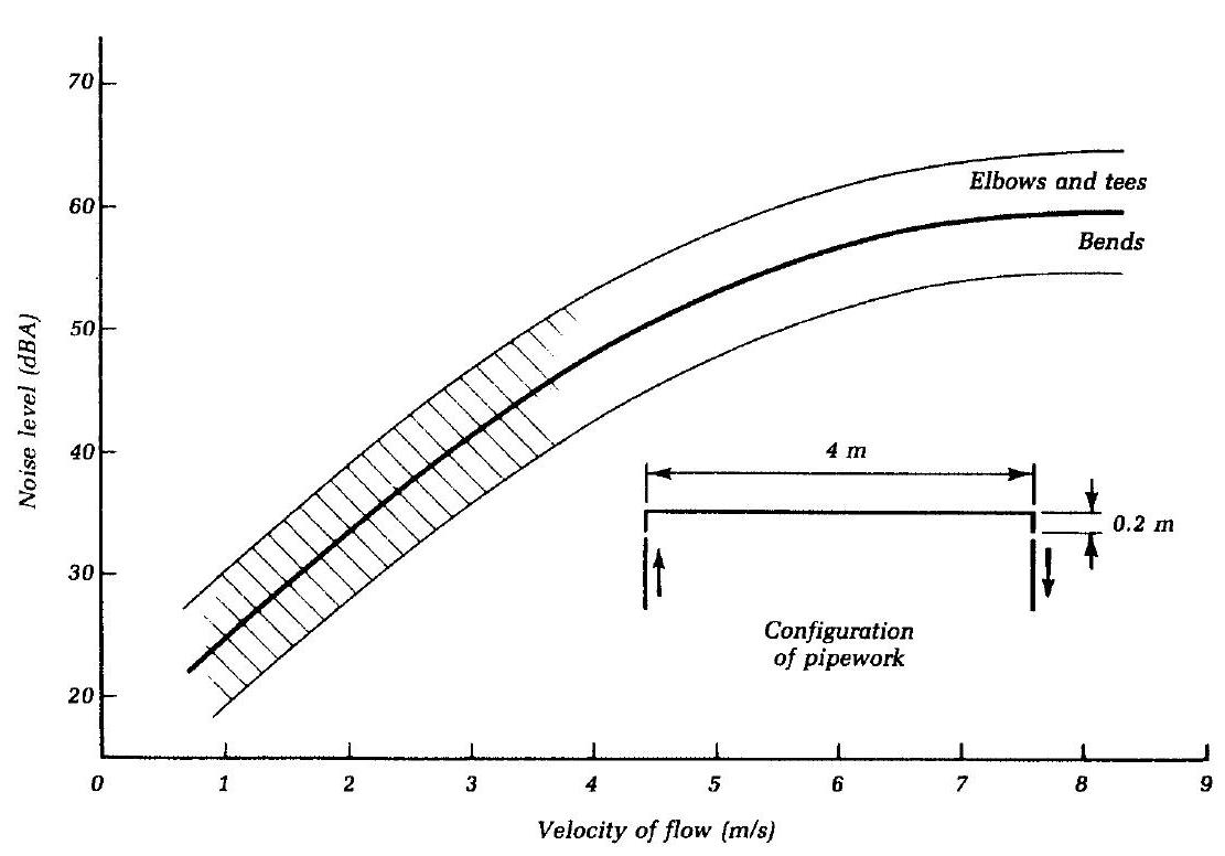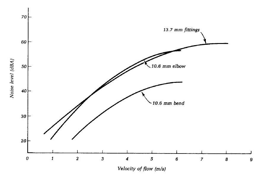 Vận tốc quá mức trong đường ống và sự sụt giảm áp suất quá mức ở các thiết bị phụ trợ đầu cuối, như được trình bày trong các phần trên, là các yếu tố có khả năng làm phát sinh tiếng ồn. Giới hạn trên 3 m / s một cách hợp lý có thể được coi là hướng dẫn cho việc kiểm soát tiếng ồn trong đường ống, (BS 6700), giới hạn này không nhất thiết phải áp dụng cho độ dài ngắn của đường ống có đường kính trong nhỏ phục vụ các cụm vòi kết hợp. Việc sử dụng hợp lý các van giảm áp trong hệ thống đường ống cung cấp hoạt động dưới áp suất đáng kể có thể đem lại