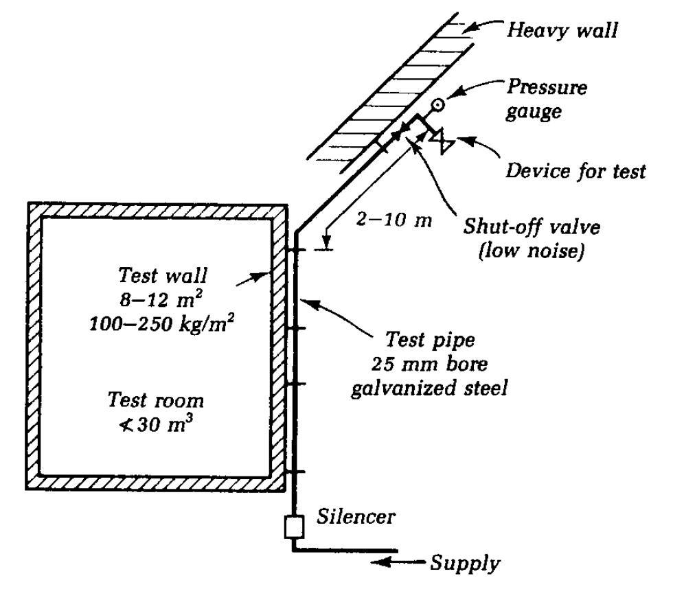 Ống thử nghiệm phải được lắp cứng, không có lớp cách nhiệt, trên tường thử nghiệm bằng cách sử dụng bốn giá đỡ cách đều nhau. Bất kỳ đồng hồ đo lưu lượng nào cũng phải được lắp cách xa cách bố trí này và một đồng hồ đo mức âm thanh chính xác sẽ được sử dụng để đo tiếng ồn. Phạm vi áp suất và lưu lượng được đề xuất có mối liên quan đến nhau, ít nhất là đối với các tình huống trong nhà, tương ứng là lên đến 5 bar và lên đến 2l/ s với nước ở nhiệt độ lên đến 25 ° C. Bộ điều chỉnh áp suất có thể cần được thử nghiệm lên đến 10 bar.