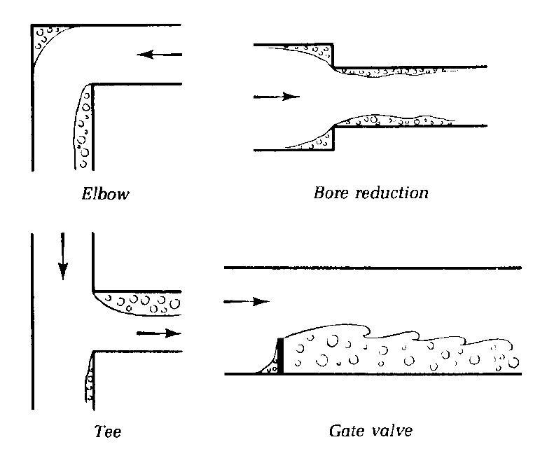 Các điều kiện thể hiện trong hình 10.3 đều phù hợp để xảy ra hiện tượng xâm thực, sự thay đổi tiết diện hoặc hướng chảy sẽ gây giảm áp suất. Như đã mô tả cho đến nay, ảnh hưởng của sự thay đổi như vậy là một trong những sự tách biệt dòng chảy cục bộ và hỗn loạn nhưng xâm thực có thể xảy ra nếu quá trình chuyển đổi được thực hiện đầy đủ.