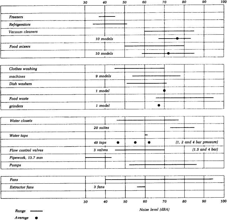 Kết quả của phép đo mức độ tiếng ồn từ các thiết bị và thiết bị khác nhau được sử dụng trong các tòa nhà được mô tả trong Hình 10.2. Mỗi dòng đại diện cho một nghiên cứu, vẽ trên các nguồn được chỉ ra. Phạm vi tiếng ồn tạo ra tương đối rộng và giới hạn trên có thể vượt quá 90 dBA. Những số liệu này thường liên quan đến các điểm gần nguồn và mức độ tiếp xúc ít cách xa nguồn hơn là điều tất nhiên - có lẽ ít hơn 10−20 dBA trong phòng liền kề. Bốn ví dụ đầu tiên trong hình bao gồm các thiết bị thường được sử dụng có thể đóng vai trò là các điểm hữu ích để so sánh với phần còn lại của dữ liệu được quan tâm trực tiếp hơn. Máy xay thực phẩm có thể gây ra tiếng ồn cao nhất trong các loại thiết bị được liệt kê ở đây. Các tủ chứa nước được coi là cho kết quả rất khác nhau với phạm vi từ khoảng 45 đến 85 dBA. Tuy nhiên, điều này có liên quan đến một loạt các thiết bị từ các dãy phòng ở tầng cao ồn ào hơn vẫn được sử dụng ở Anh và van xả cấp nước trên một số dãy phòng ở Mỹ, đến bể chứa và chảo cấp thấp hơn hoặc ghép kín yên tĩnh hơn được trang bị cơ chế xả chất lượng tốt và van cấp êm. Fuchs (1993) trích dẫn và nêu ra giá trị lên đến 45 dBA cho một số sản phẩm, tiếng ồn đo được trong phòng liền kề. Máy bơm và quạt cũng rất khác nhau quan trọng về tiếng ồn của chúng, với kích thước, tốc độ và chủng loại. Hệ thống đường ống tạo ra ít tiếng ồn hơn như được minh họa trong phạm vi cho trong hình 10.2. Trong khi đó, mức ồn nền chung trong một căn phòng yên tĩnh ở khu vực đô thị có thể là 30 đến 40 dBA.