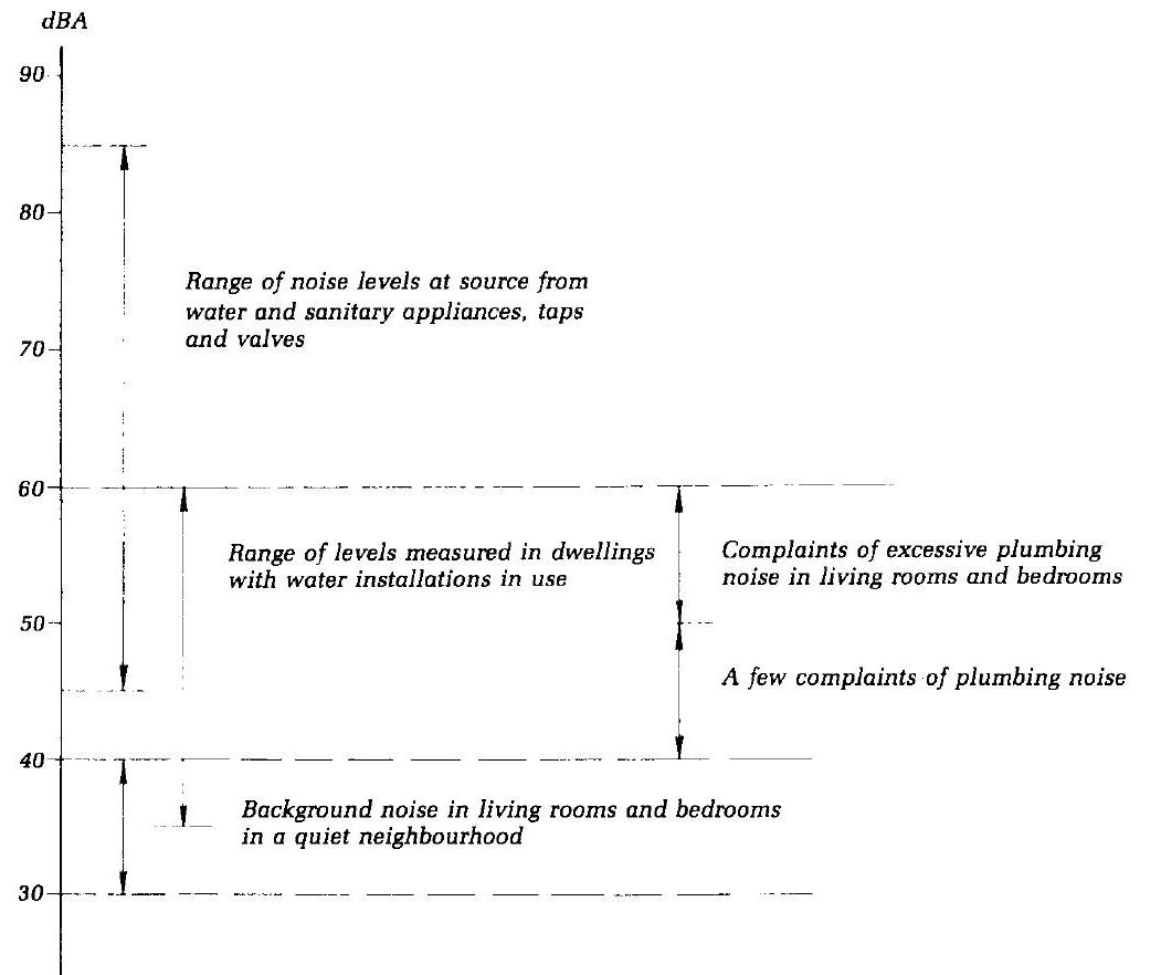 Chúng tôi có thể lưu ý với bạn rằng các khiếu nại về tiếng ồn quá mức của hệ thống ống nước đã phát sinh khi mức độ ồn trong các ngôi nhà ở Vương quốc Anh, tức là trong phòng khách và phòng ngủ, nằm trong khoảng 50−60 dBA, với một số khiếu nại phát sinh trong khoảng 40− 50 dBA. Các phép đo tổng quát hơn trong các ngôi nhà, không liên quan đến các khiếu nại, đã đưa ra mức âm thanh trong khoảng 35−60 dBA khi sử dụng hệ thống ống nước. Một lần nữa, tiếng ồn ở mức chung trong các phòng khách và phòng ngủ ở khu vực lân cận yên tĩnh thường nằm trong khoảng 30−40 dBA. Cuối cùng, chúng tôi có thể lưu ý lại tham chiếu ở trên về giới hạn 30 dBA được áp dụng cho việc lắp đặt dịch vụ trong các tòa nhà. Thông thường (hình 10.2) mức ồn tại các nguồn ống nước và các thiết bị vệ sinh và thiết bị phụ trợ nằm trong khoảng 45 - 85 dBA. Do đó, ta cần chú ý đến cả nguồn tạo ra và đường dẫn tiếng ồn nếu mức độ đo được trong các phòng có người sử dụng rơi vào khoảng 30−40 dBA. Thông tin này được tóm tắt trong hình 10.12.