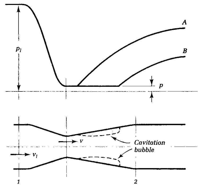 Hiện tượng này có thể được minh họa bằng cách tham khảo hình 10.4 mô tả sự thay đổi áp suất và vận tốc thông thường khi giảm mặt cắt ngang của đường nước, một ứng dụng của phương trình Bernoulli (chương 8). Dòng chảy tới chỗ co nhỏ lại có vận tốc r1, và áp suất tương ứng là p1. Ngay bên ngoài họng, nơi dòng chảy tách khỏi thành ống, vận tốc tăng lên r và áp suất giảm tương ứng với p. Nếu tốc độ dòng chảy và kích thước đường ống thỏa mãn điều kiện áp suất p này gần bằng áp suất hơi của nước, các bong bóng hơi sẽ được giải phóng trong và gần vùng xoáy ngay ngoài điểm của đường kính trong nhỏ nhất. Dòng áp suất cao hơn cần thiết để làm xẹp các bong bóng xảy ra về phía p2. Đối với một lưu lượng và áp suất đầu vào nhất định và giả sử rằng áp suất p ở họng bằng áp suất hơi, thì mức độ và cường độ của sự xâm thực phụ thuộc vào áp suất ở phía hạ lưu - hãy so sánh các đường cong A và B.