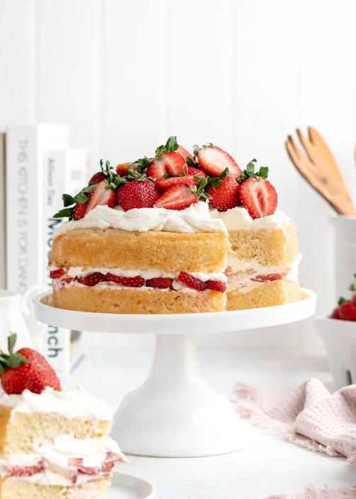 tốc độ trung bình cho đến khi kem bông nhẹ. Phủ kem tươi và dâu