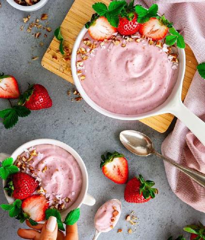 2. Xay nhuyễn dâu tây với sữa chua, nước chanh và mật ong. Đổ hỗn hợp dâu tây sữa chua vừa xay vào hộp. Cho vào ngăn đá tủ lạnh. Đợi khoảng 60-90 phút, tùy theo độ lạnh của tủ đá.