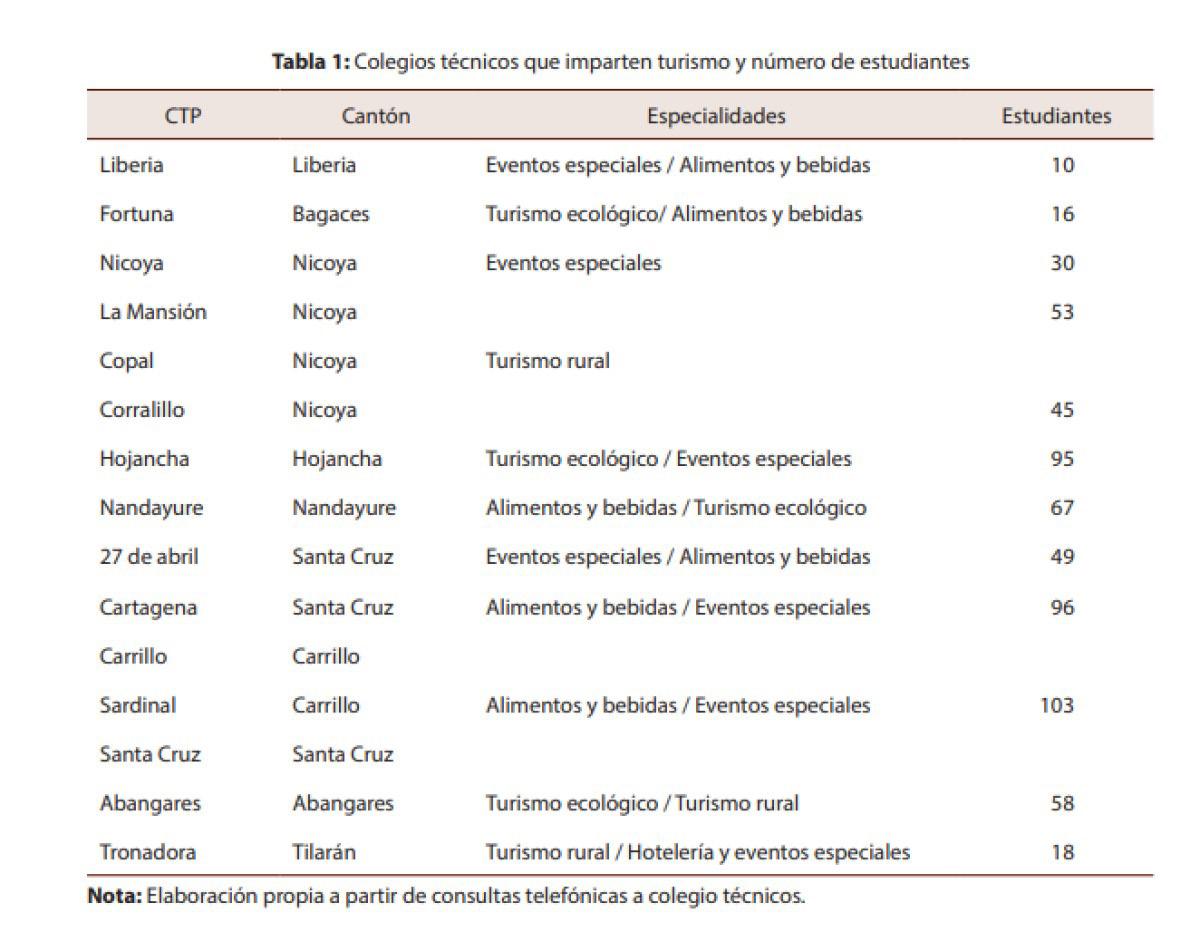 Fuente: “Currículo y desarrollo turístico en Guanacaste, Costa Rica: Un análisis de los niveles de educación técnico y superior”, Esteban Barbo za-Núñez, de la Universidad Nacional de Nicoya.