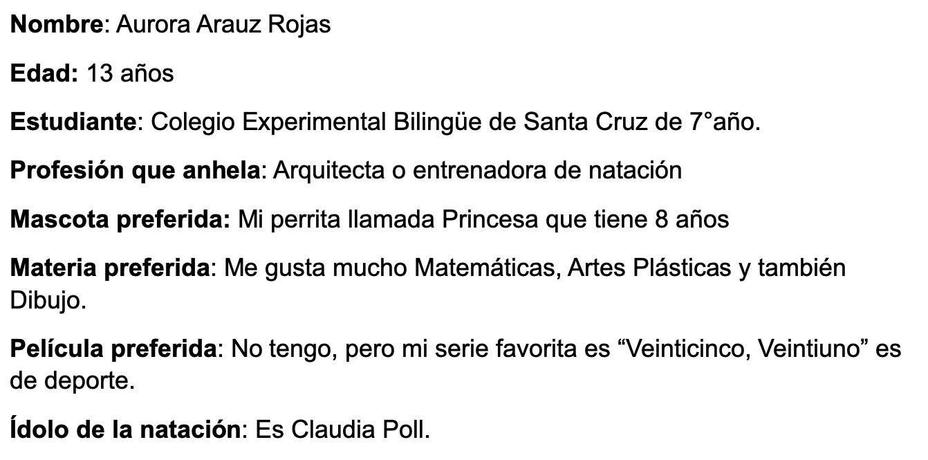 Desde ya le deseamos éxitos a nuestra sirena de la Ciudad Folclórica, Aurora Arauz Rojas y esperamos que siga creciendo en esta disciplina de la natación, para que siga cosechando medallas a nivel nacional e internacional.