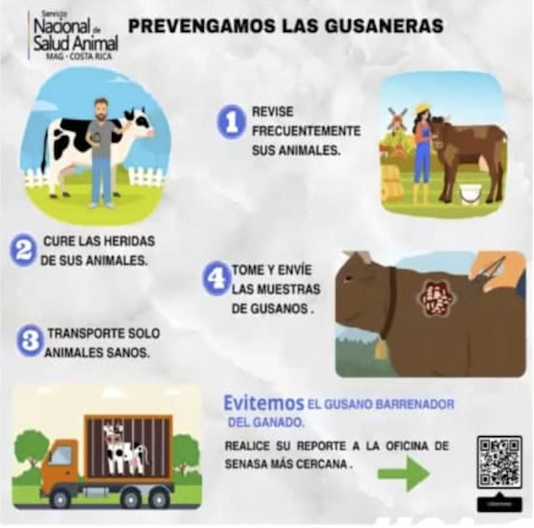 El primer caso de Gusano Barrenador en Costa Rica se reportó en julio de 2023, en un perro cerca de la frontera con Panamá. Este caso activó inmediatamente una alerta sanitaria, que fue seguida por la implementación de medidas de control basadas en cuatro componentes clave: vigilancia, comunicación, control de movimientos de animales, y dispersión de moscas. Estas acciones buscan contener la propagación de la enfermedad.
