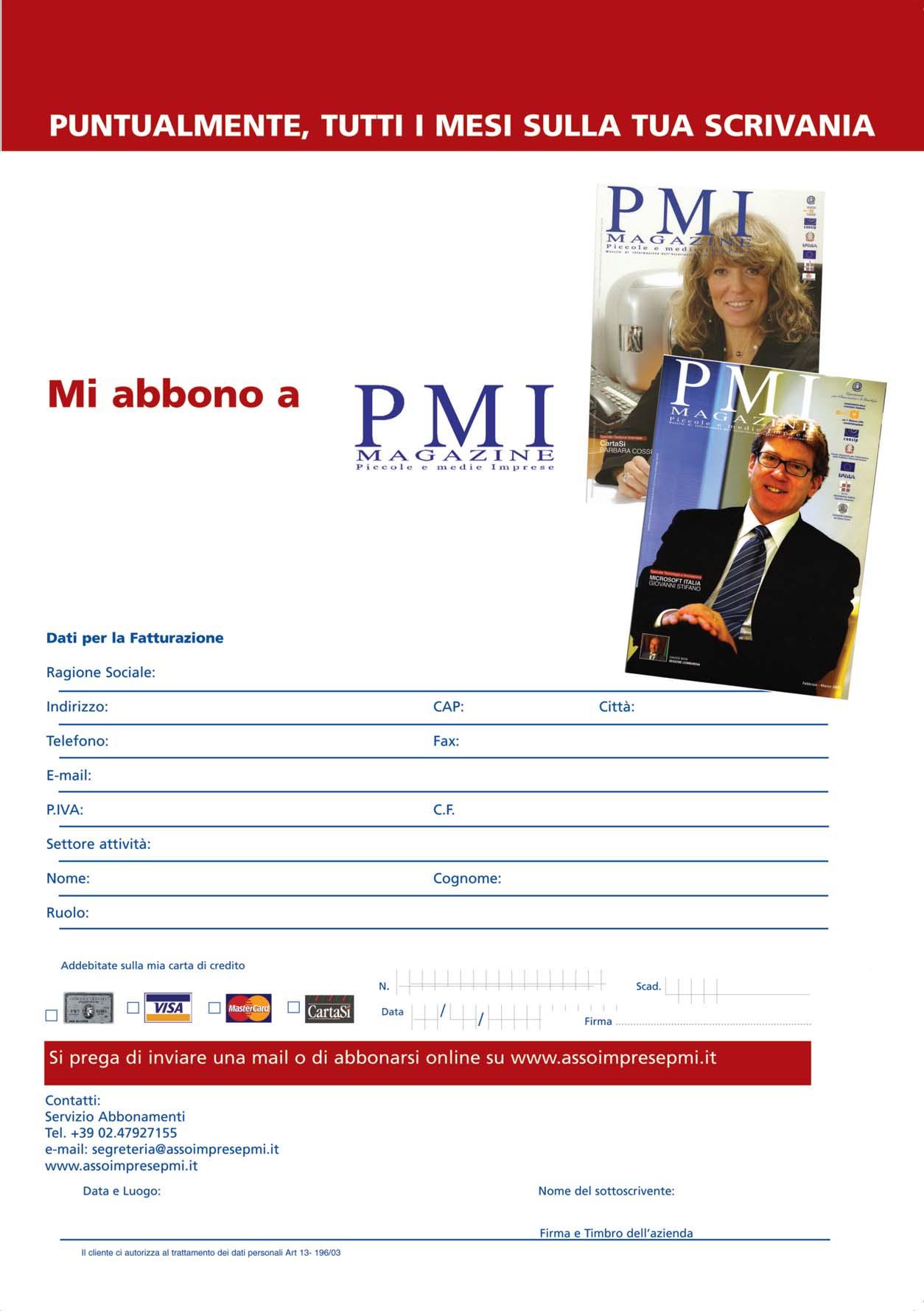 Mensile Ufficiale dell’AssoimpresePMI - Associazione Industriali Piccole e Medie Imprese Italiane Il mensile è presente presso l’osservatorio per le piccole e medie Imprese, Presidenza del Consiglio dei Ministri, Ministero del Lavoro e delle Politiche Sociali Dipartimento per l’Innovazione e le Tecnologie, Dipartimento della funzione Pubblica, Ministero dell’Economia e delle Finanze - Consip, Centro per l’informatica nella Pubblica Amministrazione - Cnipa, Associazione Italiana Tesorieri d’impresaaiti, Associazione Italiana Sistemi Informativi in Sanità e presso la commissione Europea (BRUXELLES)
