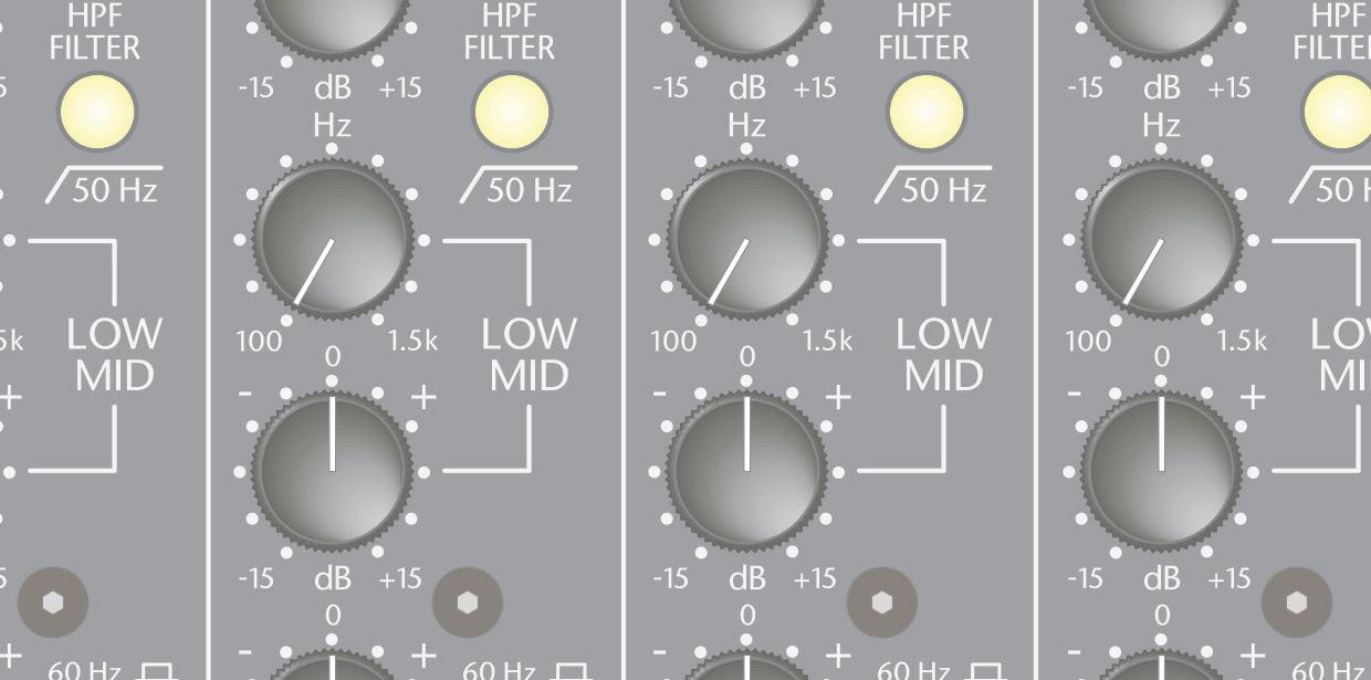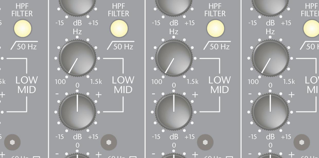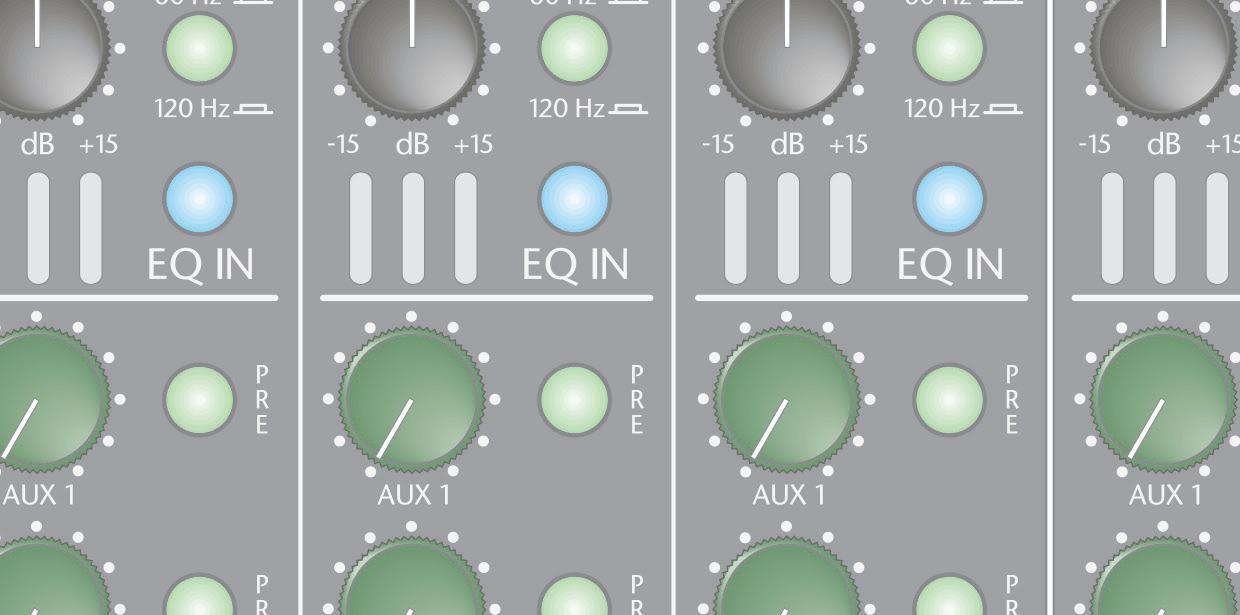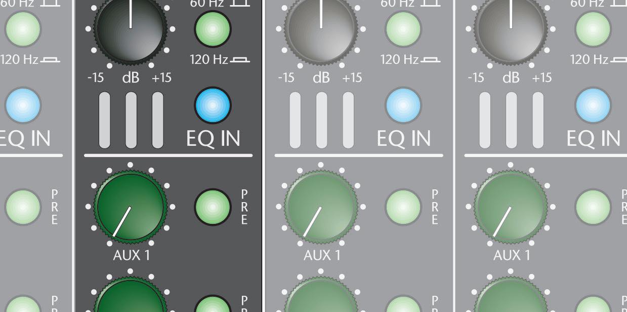 Adjusts the low frequency shelving EQ response. The Level control adjusts the cut/boost between +/- 15dB of the selected “knee” frequency, this frequency is selectable between 60Hz or 120Hz. The centre “0” position of the Level control has a detent to indicate that it is having no effect on the associated channel signal. Cut or boost of the low frequency level control is usually used for minor tonal adjustments.