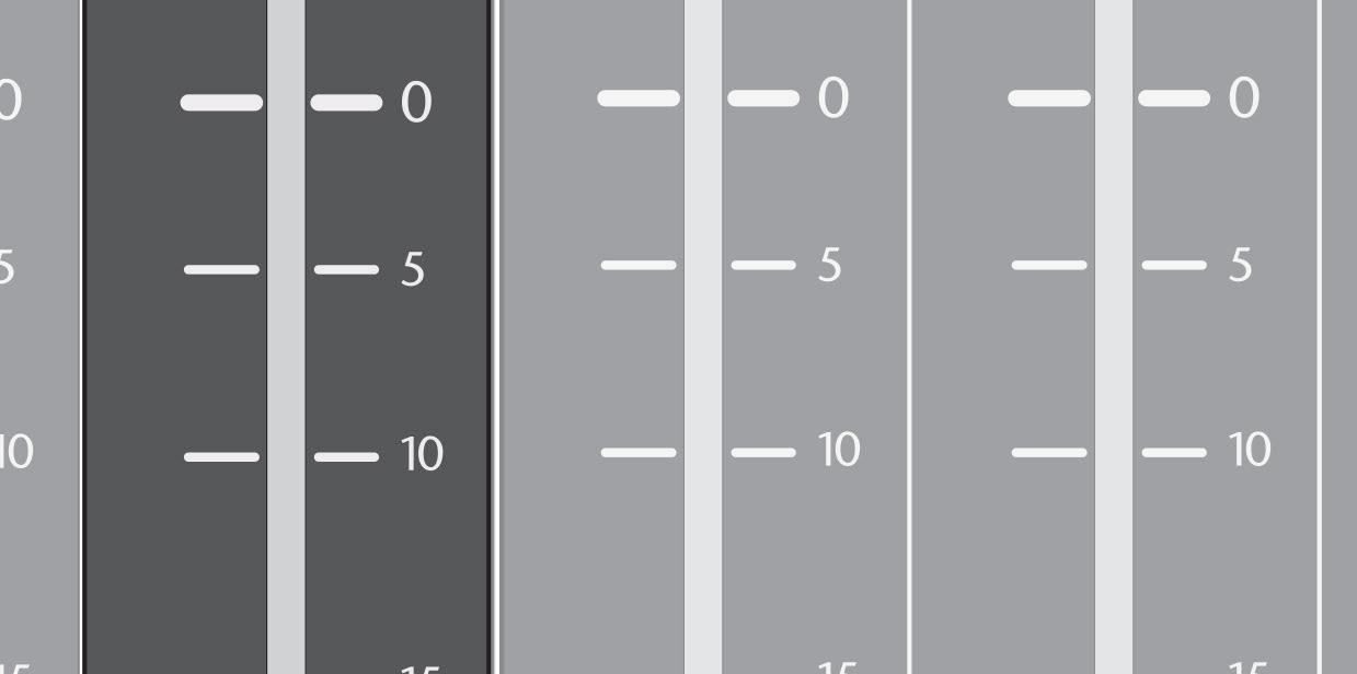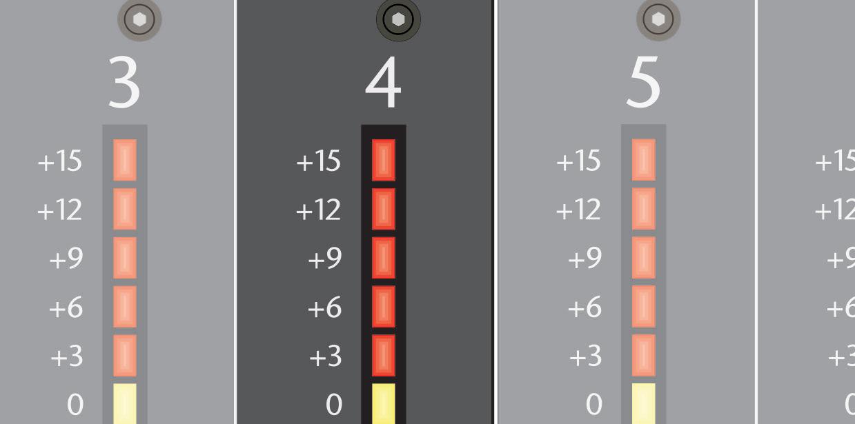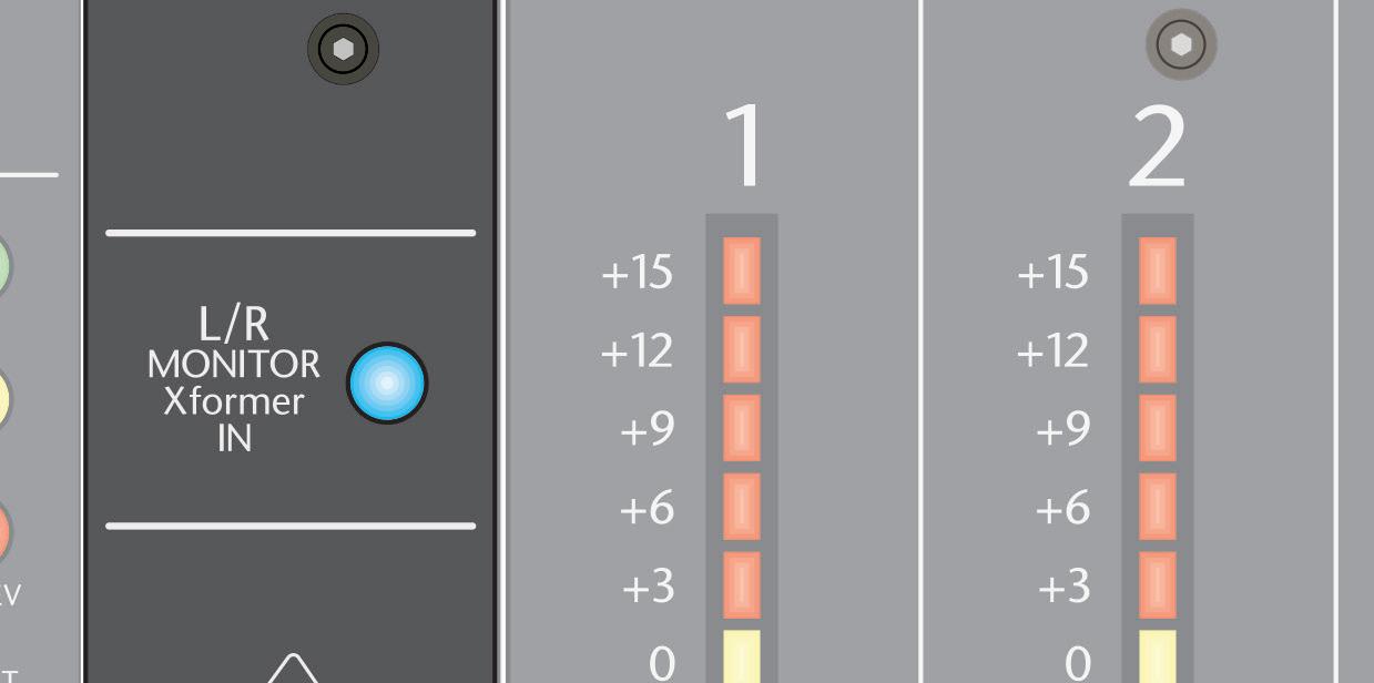 +10 – Indicates RED when the channel signal level has reached +14dBu (+10 VU) -20 – Indicates GREEN when the channel signal level has reached -16dBu (-20 VU) The channel indicator signal source can be selected pre or post the channel fader through an option available on the input module circuit board. (Note: Signal headroom available on the input module is +22dBu and when the +10 indicator illuminates the signal level is approaching 6 to 8 dB before clipping when just flashing red with signal peaks). These are extremely useful features and provide a constant indication that a signal is present in the module (green LED) and that the signal peak is being reached (red LED).