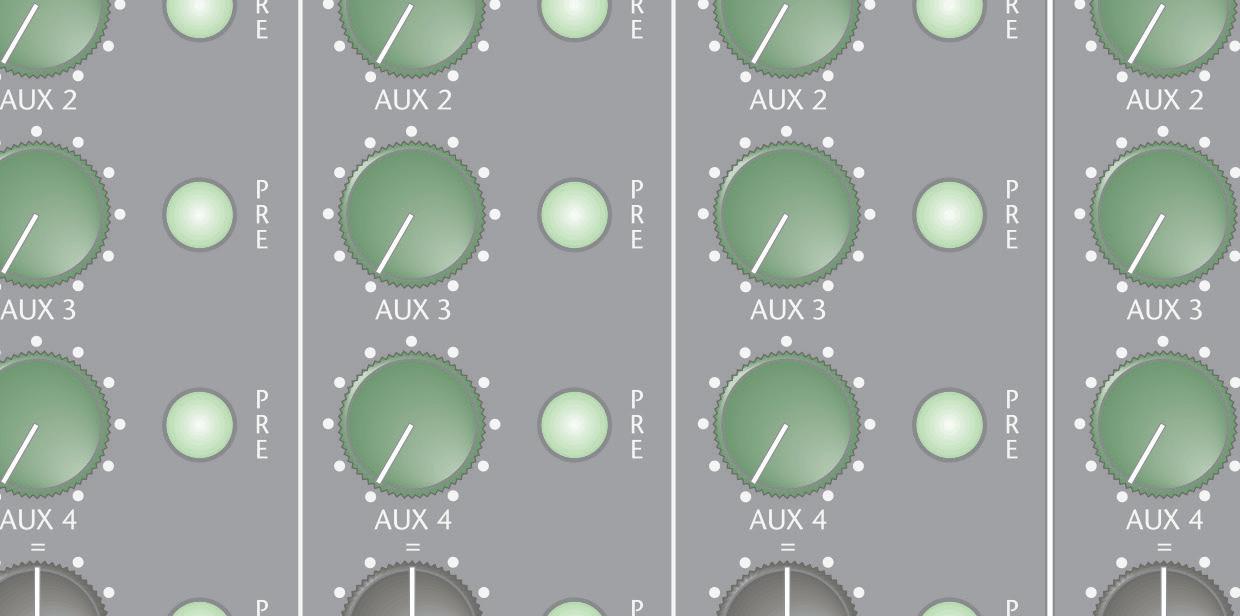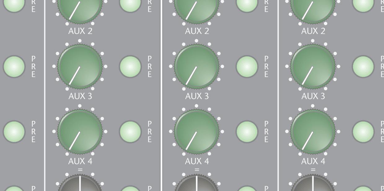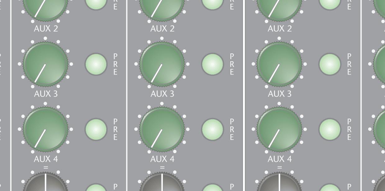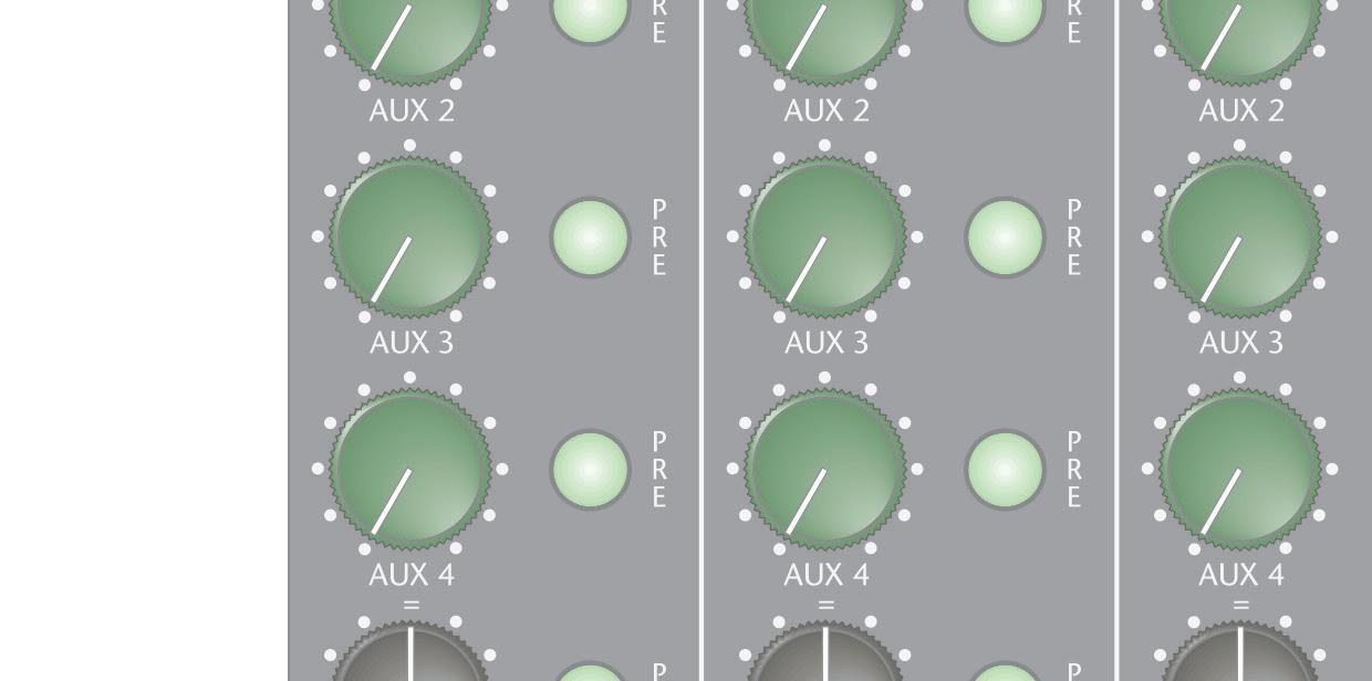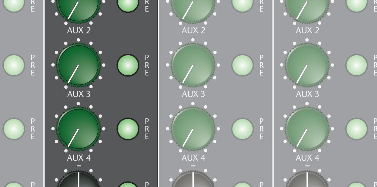 Six Auxiliary sends are provided, four mono and one stereo, each can be switched pre or post the channel fader. Aux 5/6 can also be selected between the channel and monitor path, greatly adding to the flexibility of the module.