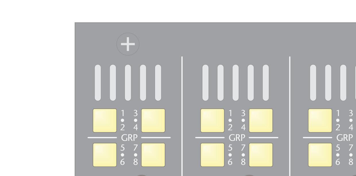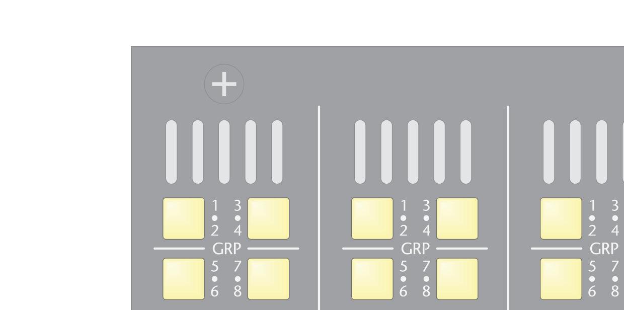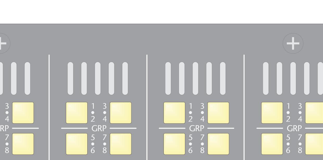 The Group section of the console greatly enhances the flexibility of the TRIDENT 78 console and provides a number of different functions. There are 8 Group modules provided on the console, these are divided into two sets of 4 Groups in separate panels and each Group strip controlling the associated group mix bus outputs. The groups can be used as audio subgroups for combining and processing a collection of input channels. Each group bus has its own balanced Insert Send/Return and Outputs that feed the associated DSUB connector on the rear Master Connector panel.