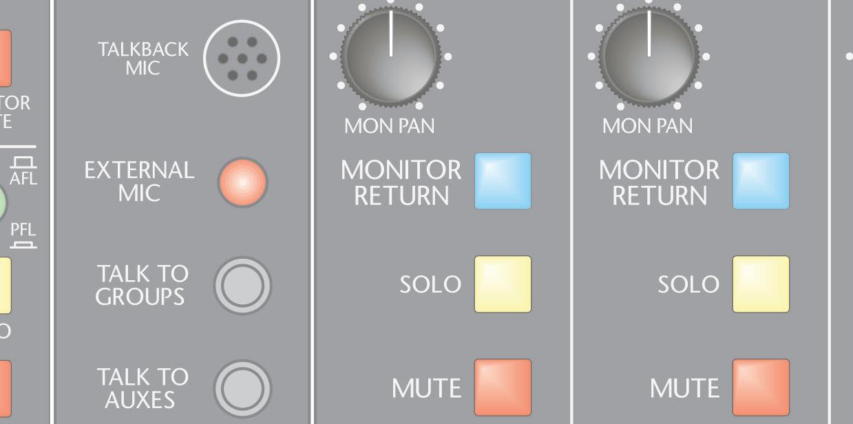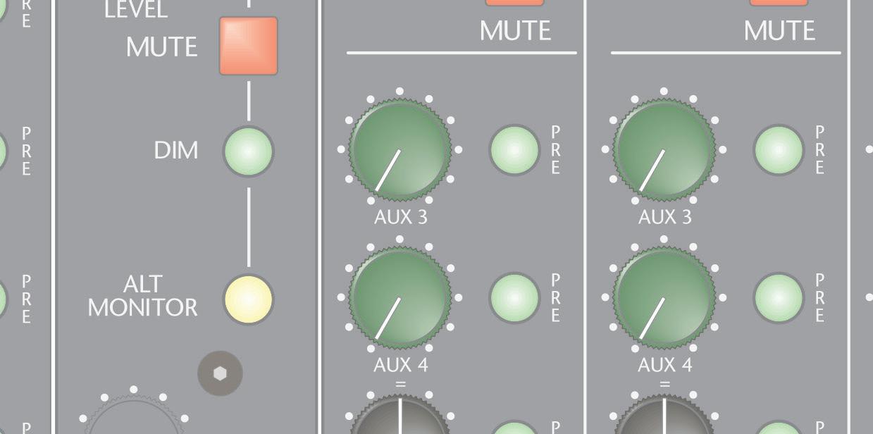 When depressed, this reduces the level of the main monitor outputs by approx 30 dB. Note: this has no effect on the main Left/Right outputs of the console.