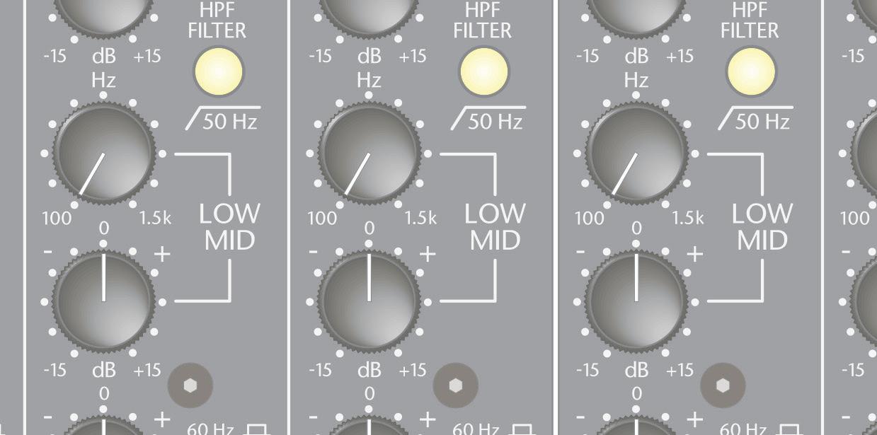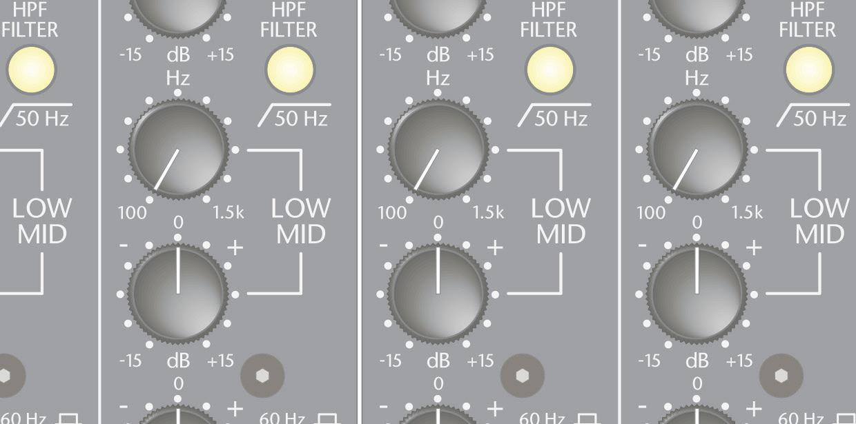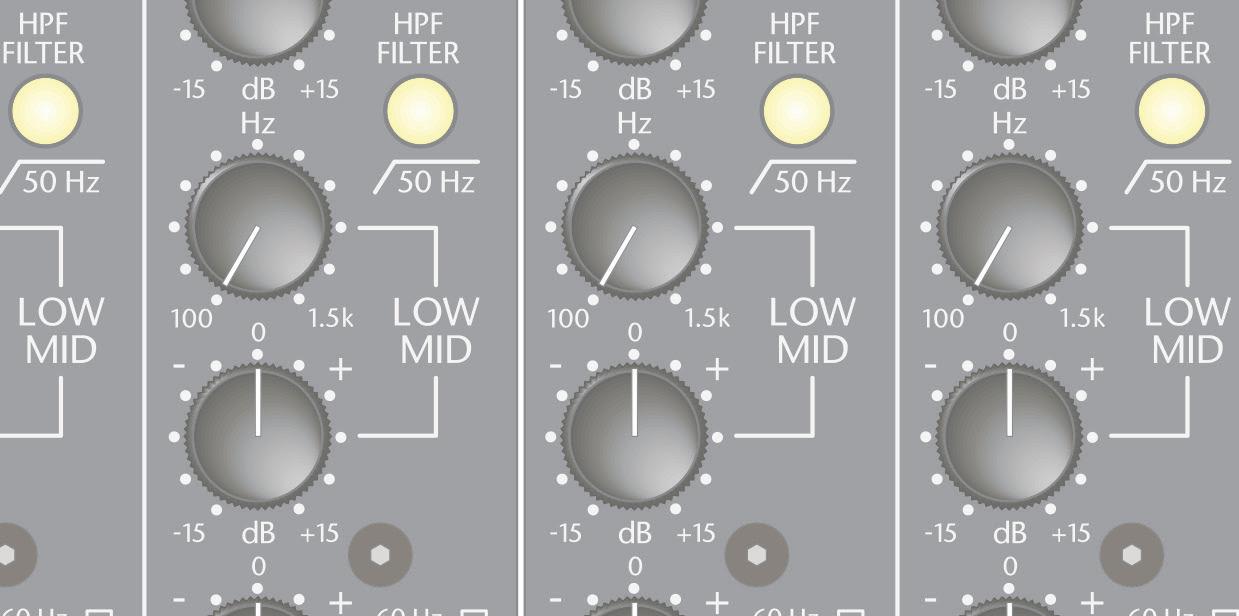 A four band Trident EQ with overlapping ranges is provided with a switchable high pass filter. The HIGH and LOW sections of the equaliser have a shelving response (switchable between two frequencies) and the mids have a peaking (bell) response.