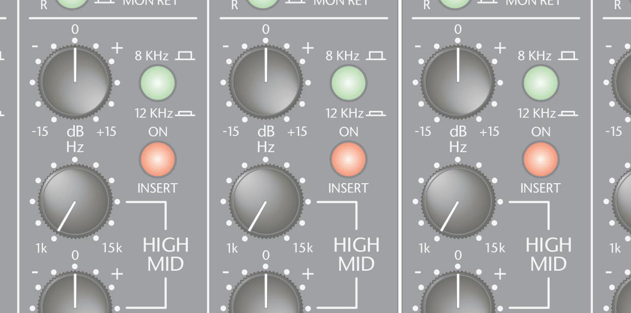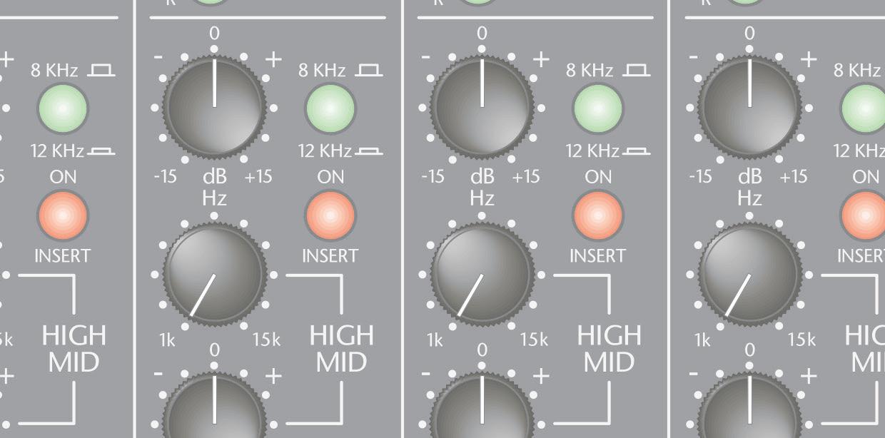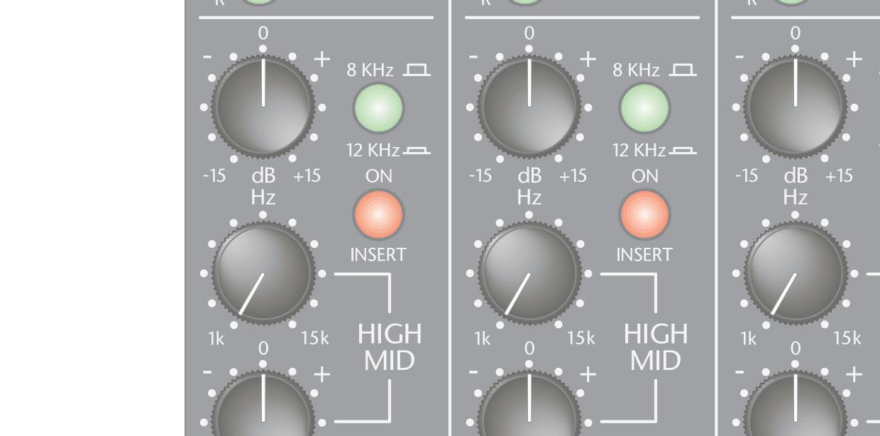 Adjusts the high frequency shelving EQ response. The Level control adjusts the cut/boost between +/- 15dB of the selected “knee” frequency, this frequency is selectable between 8KHz or 12KHz. The centre “0” position of the Level control has a detent to indicate that it is having no effect on the associated channel signal. Cut or boost of the high frequency level control is usually used for minor tonal adjustments.