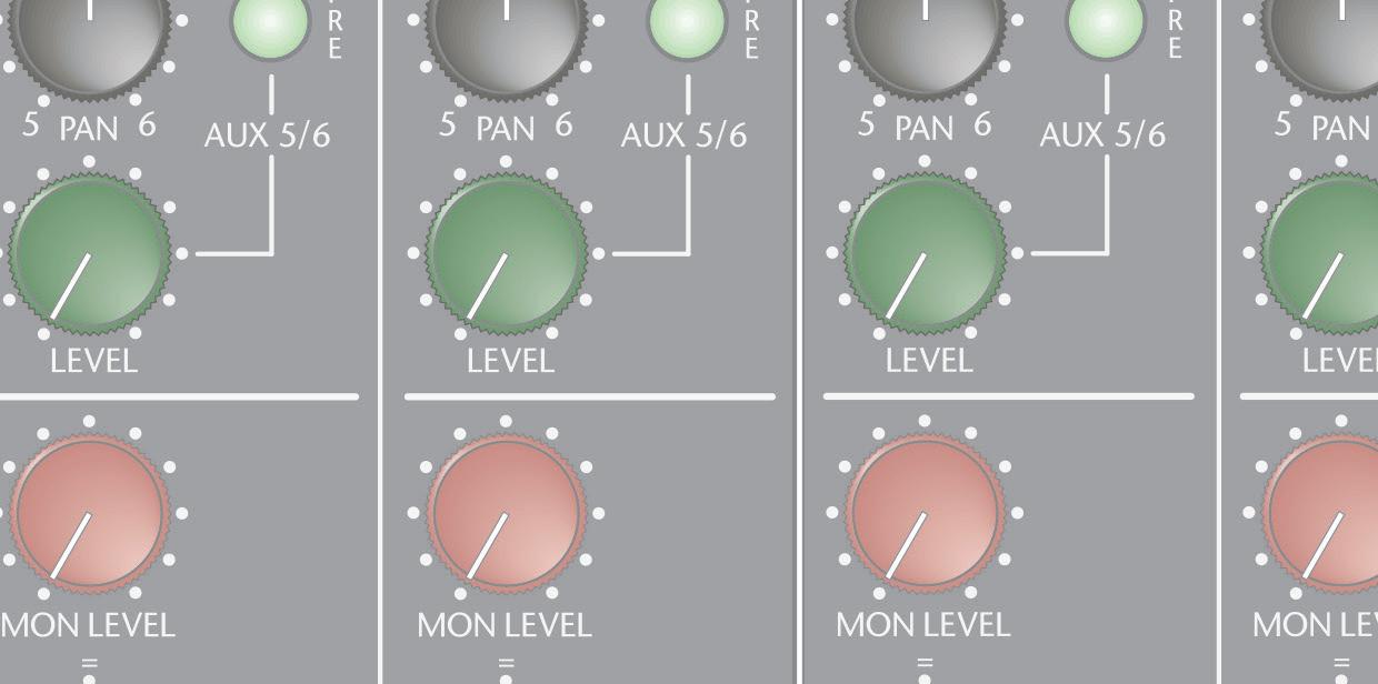 Adjusts the balance of the channel signal being fed to Aux 5 bus (CCW) and Aux 6 bus (CW). In the centre (=) position equal signal level is sent to both Aux 5 and Aux 6 buses.