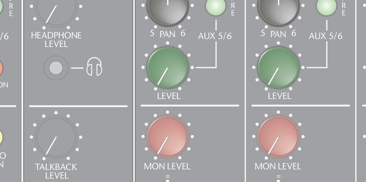 This control adjusts the Aux 1 bus mix level that appears on the associated Aux Output pins of the DSUB on the rear panel.