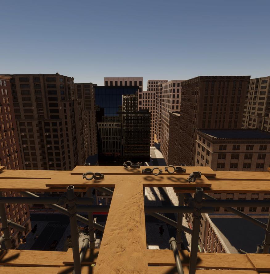 hibázunk, nem zuhanunk a mélybe, hiszen megtart bennünket a leesés elleni védelmi eszköz. Mindez félig virtuális, félig valós érzékelés, hiszen a játékszimuláció elindítása előtt ténylegesen magunkra öltöttük a munkavédelmi felszerelést, így a fizikai térben is érzékeljük, hogy megtart, hiába omlik le az állvány vagy lépünk a palló mellé.