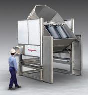 TIP-TITE® Container Dumpers dump bulk material from drums (shown), boxes or other containers into vessels up to 10 ft (3 m) high. Dust-tight (shown) or open chute models improve efficiency and safety of an age-old task.
