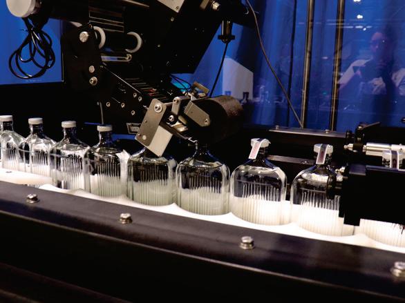 Automatiza la aplicación de sellos fiscales en botellas de licor en una sola máquina.