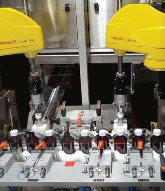 ↑ ESS Technologies’ Robotic Capping System integrates one, two, or three Fanuc SR-3iA robots with an ESS-designed gripper-style EOAT.
