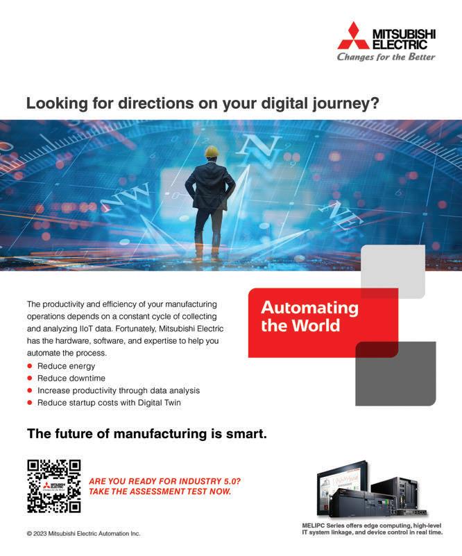 Automation World ® (ISSN # 15531244, USPS 22435) is a registered trademark of PMMI, The Association for Packaging and Processing Technologies Automation World ® is published 12 a year by PMMI with its publishing office, PMMI Media Group, located at 401 N. Michigan Avenue, Suite 1700, Chicago, IL 60611; 312.222.1010; Fax: 312.222.1310. Periodicals postage paid at Chicago, IL, and additional mailing offices. Copyright 2023 by PMMI. All rights reserved. Materials in this publication must not be reproduced in any form without written permission of the publisher. Applications for a free subscription may be made online at AutomationWorld.com/subscribe. Paid subscription rates per year are $105 in the U.S., $147 Canada and Mexico by surface mail; $250 Europe, South America. $325 Far East and Australia by air mail. To subscribe or manage your subscription to Automation World, visit AutomationWorld.com/subscribe. Free digital edition available to qualified individuals outside the United States. POSTMASTER; Send address changes to Automation World®, 401 N. Michigan Avenue, Suite 1700, Chicago, IL 60611. PRINTED IN USA by Quad Graphics. The opinions expressed in articles are those of the authors and not necessarily those of PMMI. Comments, questions and letters to the editor are welcome and can be sent to: editors@automationworld.com. We make a portion of our mailing list available to reputable firms. If you would prefer that we don’t include your name, please write us at the Chicago, IL address. Volume 21, Number 3.