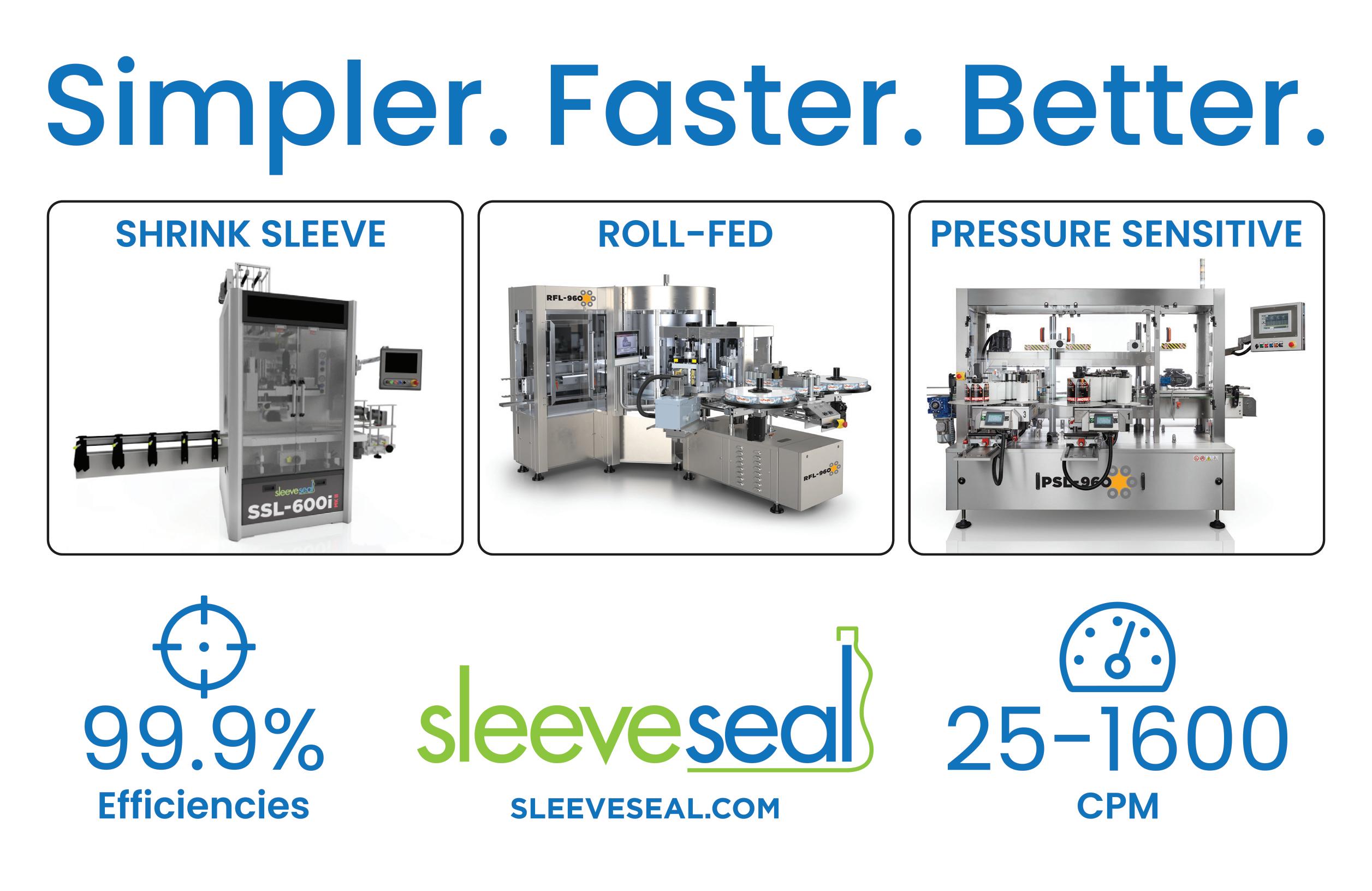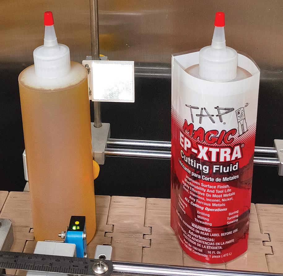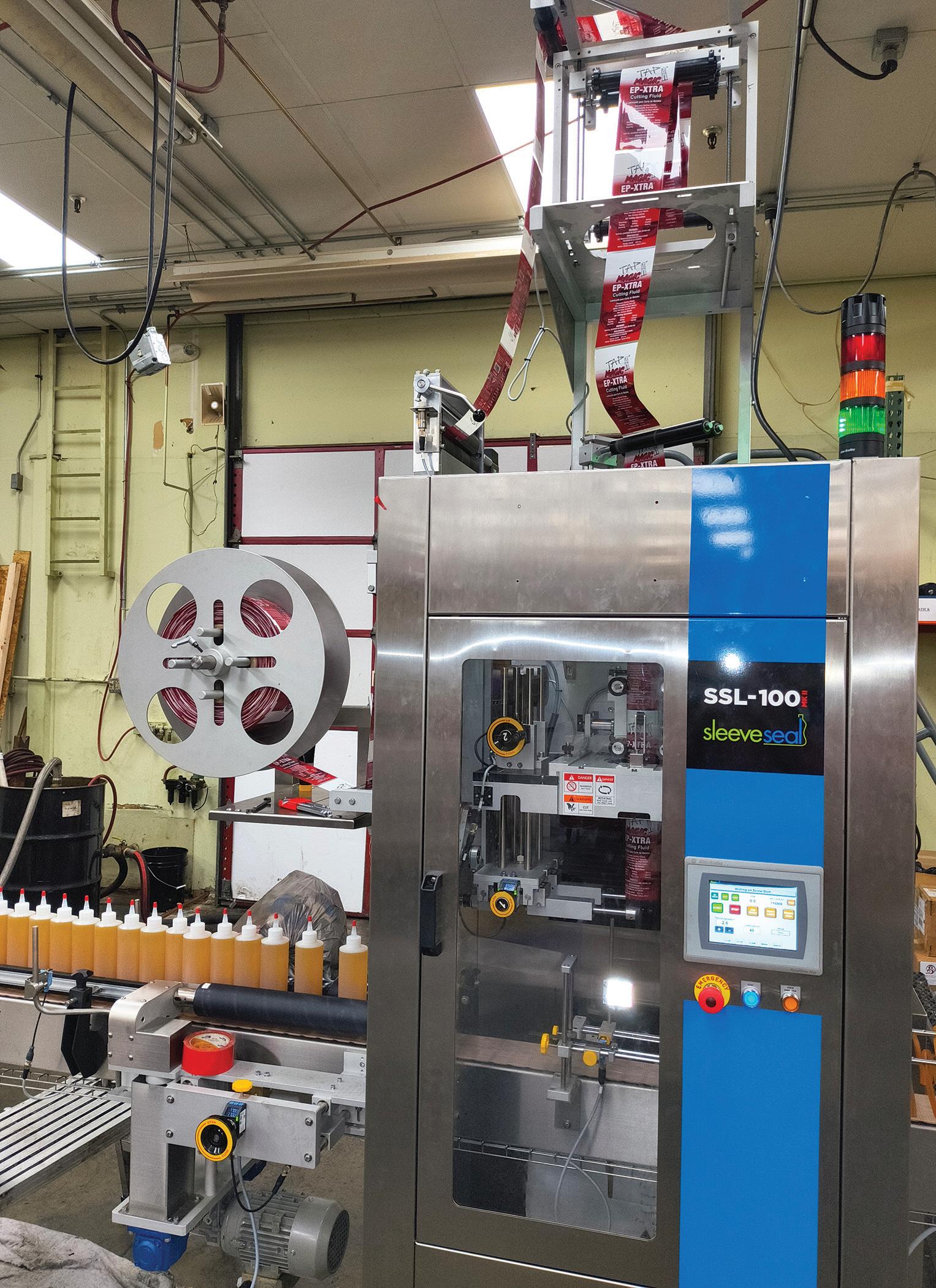 Tap Magic has found the shrink sleever to be a great solution for three different container formats. Shown left, 16-oz HDPE bottle in production at Tap Magic: Application of a shrink sleeve on the Sleeve Seal machine.