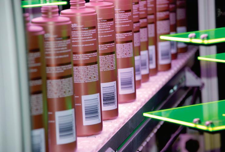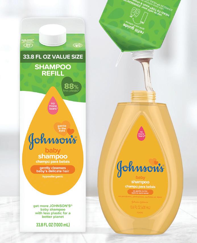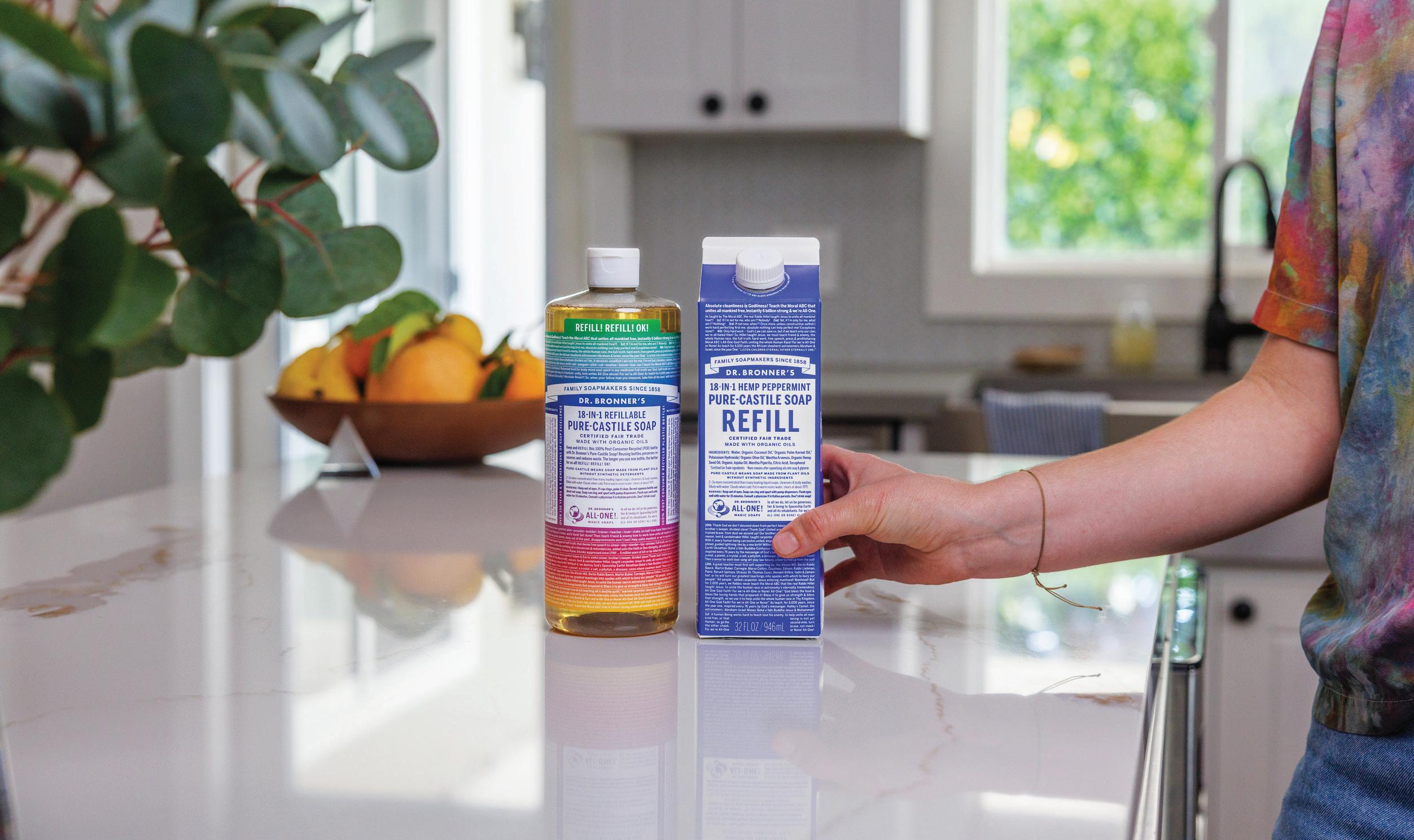 Paperboard cartons get high LCA marks, but break down when wet. Meanwhile, 100% rPET bottles are circular, work great in the shower, and if they’re re lled, are not single-use. Dr. Bronner’s re llable carton leverages both formats’ strengths.