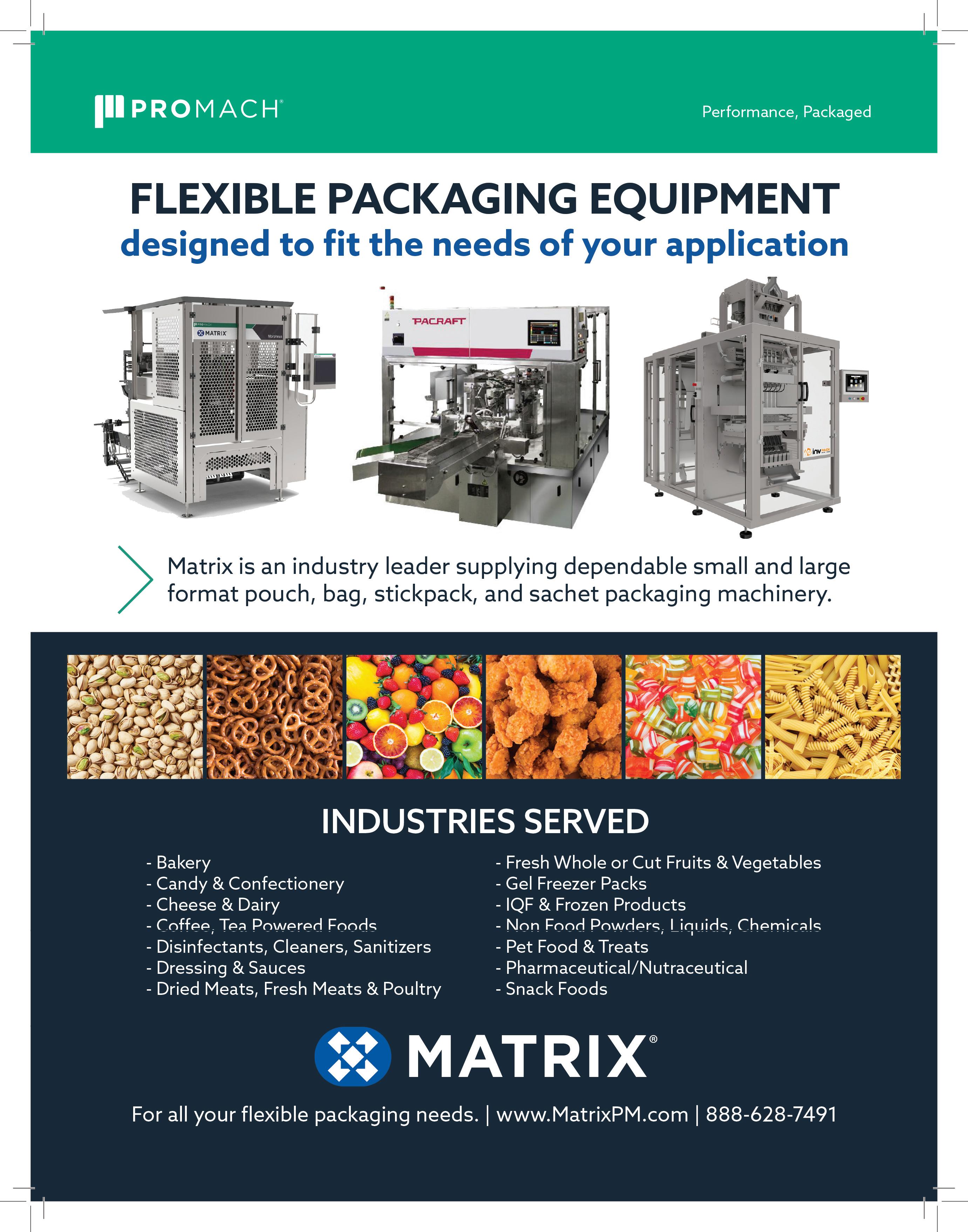 103 AD INDEX Aagard www.aagard.com 25 A-B-C Packaging Machine Corp. www.abcpackaging.com 9 ADCO Manufacturing www.adcomfg.com 36 All Packaging Machinery Corp. www.allpackagingmachinery.com 10 All-Fill, Inc. www.all-fill.com 91 Alpek Polyester USA, LLC www.alpekpolyester.com 85 Amcor Flexibles North America www.amcor.com 53 Aurora Packaging Systems, Inc. www.aurorapackagingsystems.com 26 B&R Industrial Automation Corp. www.br-automation.com 3 Bell-Mark Sales Company www.bell-mark.com 24 Bevcorp LLC www.bevcorp.com 11 BW Integrated Systems www.bwintegratedsystems.com 89 BW Packaging www.bwpackagingsystems.com 29 Cama North America www.camagroup.com 32 Catalynt Solutions, Inc. www.trichemicals.com 20 Charter Next Generation www.cnginc.com 35 Chase-Logeman Corporation www.chaselogeman.com 63 Columbia Machine, Inc. www.palletizing.com 42 CTM Labeling Systems www.ctmlabelingsystems.com 70 Diagraph Marking & Coding, An ITW Company www.diagraph.com 37 Dorner Mfg. Corp. www.dornerconveyors.com 83 EPI Labelers www.epilabelers.com 5 Eriez www.eriez.com 18 FANUC America Corporation www.fanucamerica.com 23 FlexLink Systems, Inc. www.flexlink.com 17 FOCKE & CO. www.focke.com 74 Gaia Materials www.gaiabiomaterials.com 27 Glenroy, Inc. www.glenroy.com 55 Haver & Boecker USA, Inc. www.haverusa.com 57 Heat and Control, Inc. www.heatandcontrol.com 21 High Tek USA www.hightekusa.com 69 HUGO BECK Maschinenbau Gmbh & Co. KG www.hugobeck.com 79 IMA - S.p.A. www.ima.it 39 Intertape Polymer Group www.itape.com 54 James Alexander Corp. www.james-alexander.com 43 JLS Automation www.jlsautomation.com OBC Kaufman Engineered Systems www.kes-usa.com 58 Koehler Holding SE & Co KG www.koehler.com 49 Label-Aire, Inc. www.label-aire.com 6 Leibinger www.leibinger-group.com 19 Mamata Enterprises, Inc. www.mamata.com 56 Material Transfer & Storage Inc. www.materialtransfer.com 16 Matrix Packaging Machinery, Inc. www.matrixpm.com 95 Meler USA Corporation www.meler.eu 81 METTLER TOLEDO www.mt.com/pi 47 mk North America, Inc www.mknorthamerica.com 68 Modular Conveyor Express www.modularconveyor.com 62 Morrison Container Handling Solutions www.morrison-chs.com 84 MRP Solutions www.mrpcap.com 15 Multi-Conveyor www.multi-conveyor.com 51 Nercon Conveyor Systems www.nerconconveyors.com 14, 34 Nordson Corporation www.nordson.com 93 nVenia, A Duravant Company www.nvenia.com 90 Pack Air, Inc. www.packairinc.com 80 Paxiom Automation, Inc. www.paxiom.com 41 PFlow Industries, Inc. www.pflow.com 77 PMI KYOTO www.pmikyoto.com 7 PMMI www.pmmi.org 101, 105 Pneumatic Scale Angelus www.psangelus.com 60 R.A Jones www.rajones.com 12 Robatech USA Inc. www.robatechusa.com 31 Rychiger Canada www.rychiger.com 13 Schubert North America LLC www.schubert.group 45 Shibuya Hoppmann www.shibuyahoppmann.com 102 Shurtape Technologies, LLC www.shurtape.com 59 Sidel Inc. www.sidel.com 67 Siko Products, Inc. www.siko-global.com 86 Specialty Equipment www.specialtyequipment.com 22 Spee-Dee Packaging Machinery, Inc. www.spee-dee.com 38 STA, LLC www.sta-tapes.com 61 Standard-Knapp, Inc. www.standard-knapp.com 40 Syntegon www.syntegon.com 1 Technical Adhesives Limited www.technicaladhesives.com 97 Texwrap www.texwrap.comm 99 Uline www.uline.com 94 Universal Labeling Systems, Inc. www.universal1.com 88 Vacuum Barrier Corporation www.vacuumbarrier.com 78 VDG (Van der Graaf) www.vandergraaf.com 64a Viking Masek Packaging Technologies www.vikingmasek.com 87 Weber Packaging Solutions, Inc. www.weberpackaging.com 75 WEIMA America www.weima.com 33 WestRock www.westrock.com IFC, OFC Wexxar Bel www.wexxar.com 100 Wipotec www.wipotec.com 71 Yamato Corporation www.yamatoamericas.com 92 ADVERTISER WEBSITE PAGE ADVERTISER WEBSITE PAGE Search Packworld.com for additional information on any of the advertisers listed or visit their website directly Connect with a Leaders in Packaging supplier today! www.packworld.com/leaders