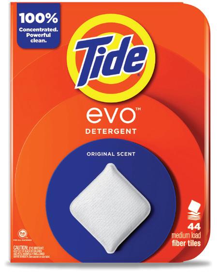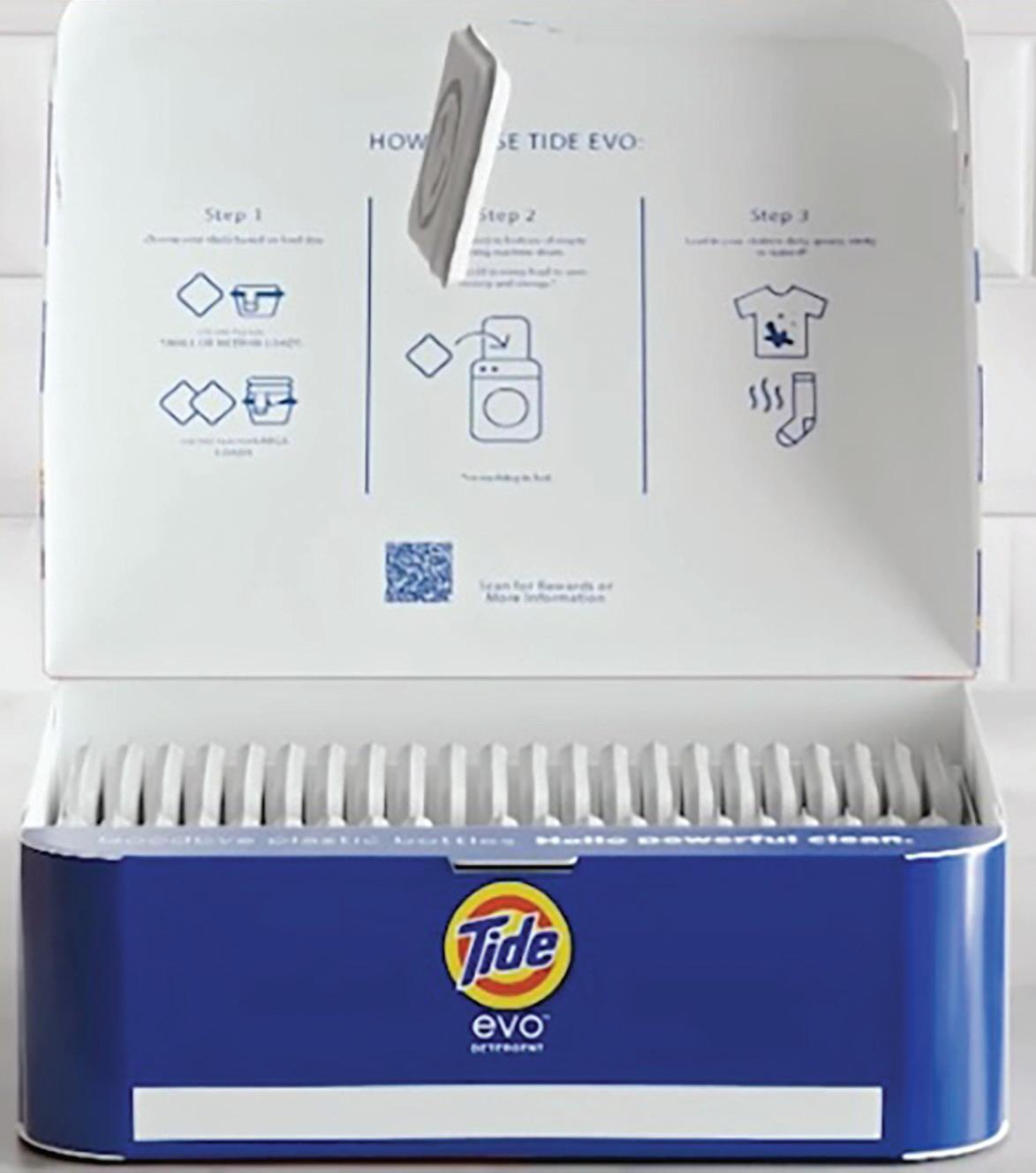 Procter & Gamble’s Tide evo laundry detergent (details on page 10) is a tsunami of product and packaging ingenuity meant to wash liquid laundry detergent bottles off retail shelves, replace them with cartons of detergent “tiles,” reorder homemakers’ washroom SOPs, and reduce the amount and temperature of water needed to wash their clothes.