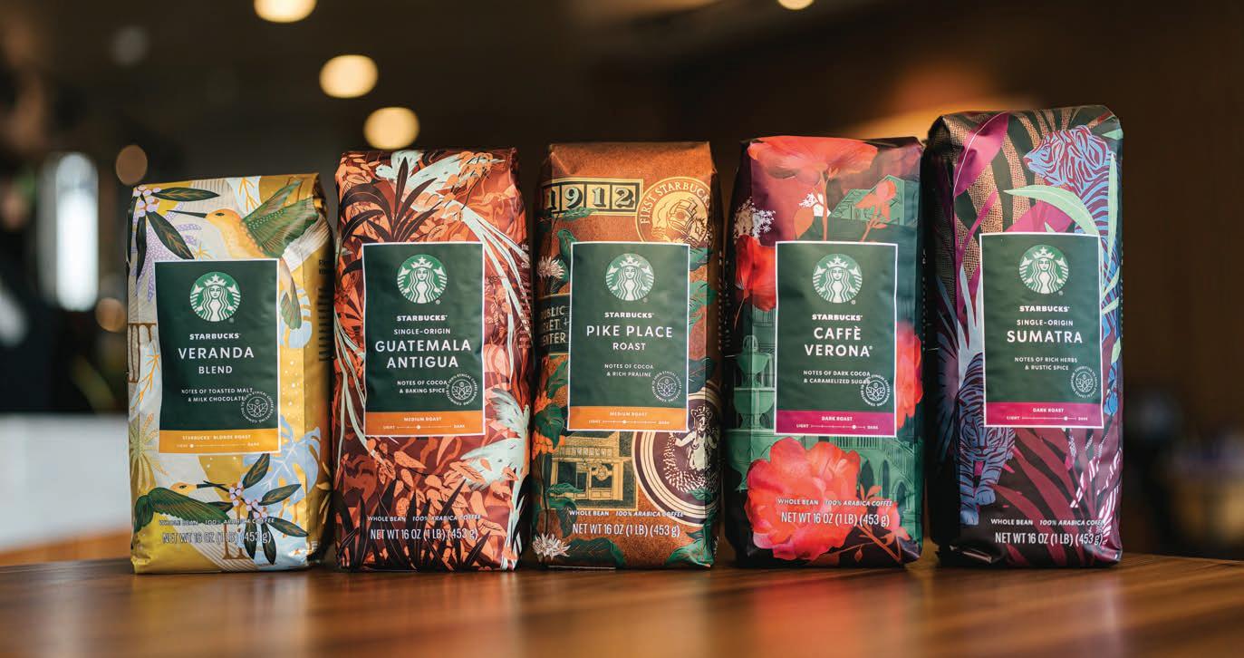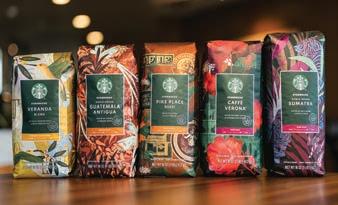 In the rst new packaging design for its core whole-bean coffee roasts in a decade, Starbucks takes its storytelling strategy to new heights, with evocative artwork that richly conveys each variety’s heritage, distinctive avor, and quality.