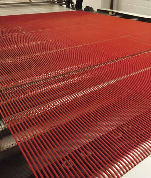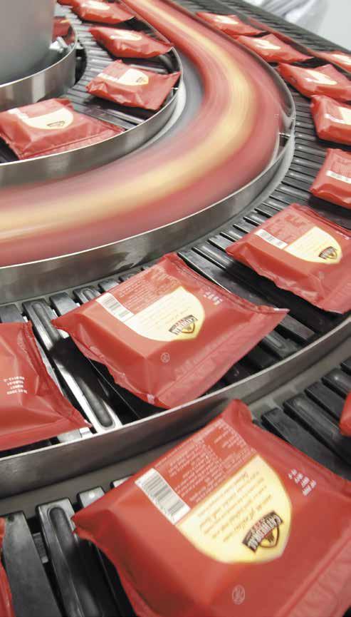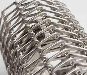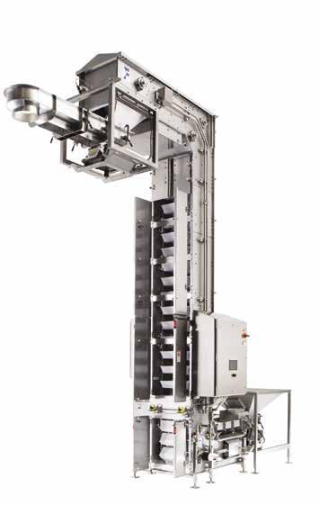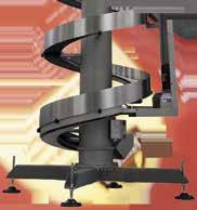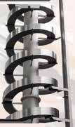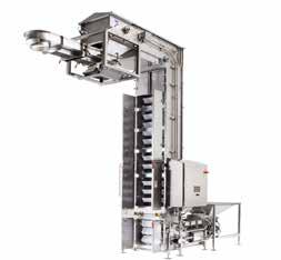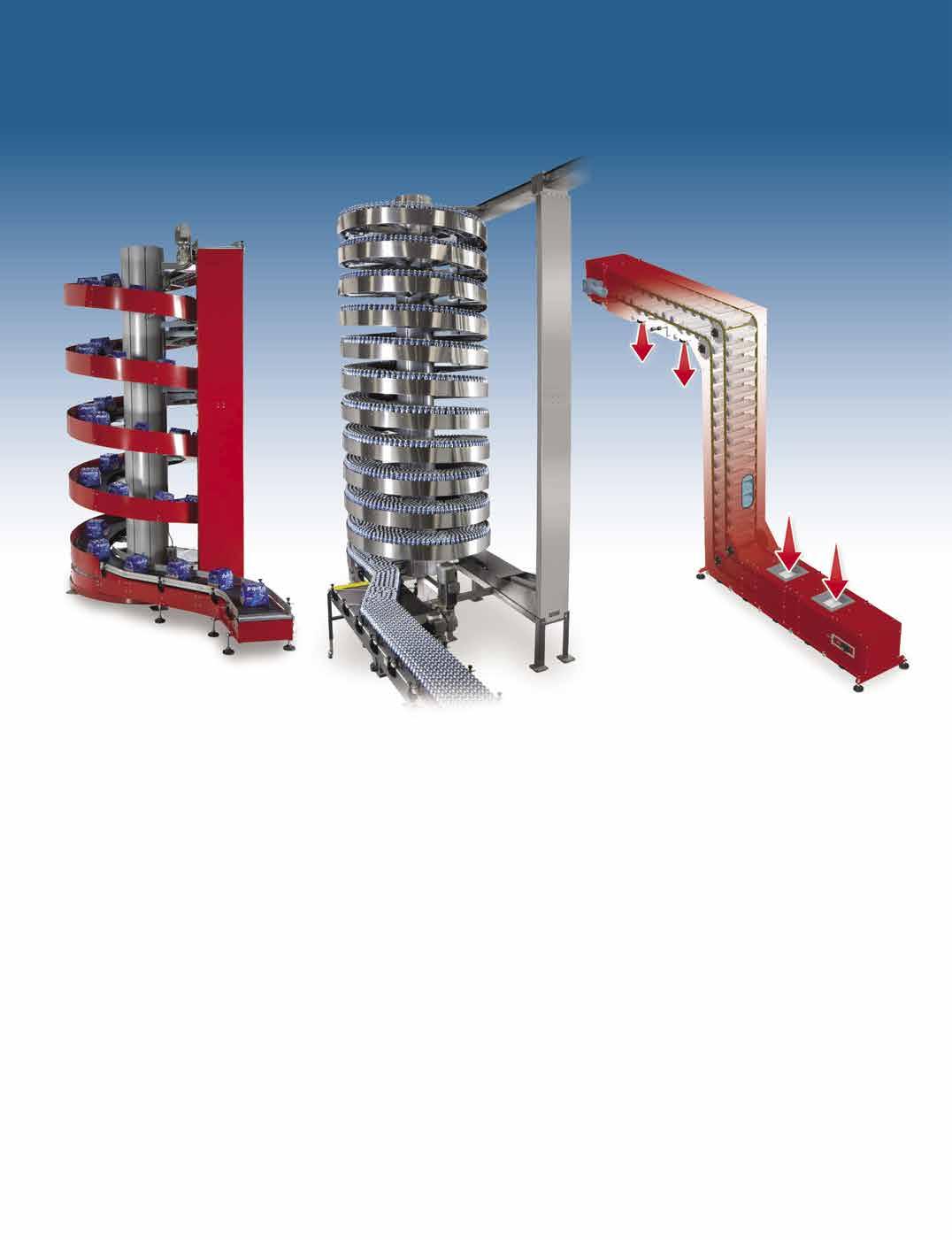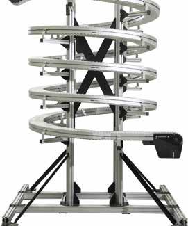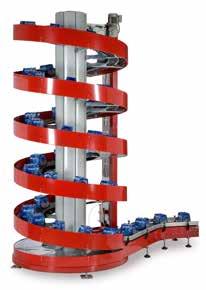 Spirals for food and beverage applications can be supplied in stainless steel or hybrid wet, which often is required with food conveyor belts in food process ing areas. A spiral conveyor occupies less floor space than a conventional conveyor and runs faster and is more reliable than an elevator or lift. Proprietary slat-type belts with rolling friction eliminate sliding movement and wear-strips.