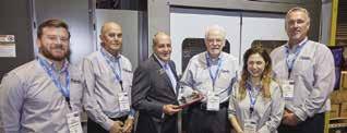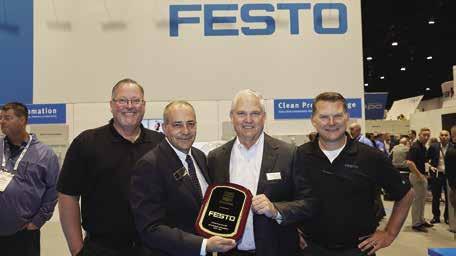 president and CEO of PMMI (second from left), presents a plaque commemorating Festo’s (Booth N-6213) 50 years in business to John Holmes, vice president of Sales, North America. Acknowledging the recognition are Troy Manley, sales director, Food and Packaging, North America (left) and U.S. Industry Segment Sales Manager Brad Schulz.