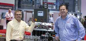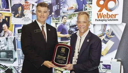 Andrew Dougherty (left), vice president of Member Services, PMMI, congratulates Doug Weber, president and CEO of Weber Packaging Solutions (Booth S-3642), on the company’s 90th anniversary.