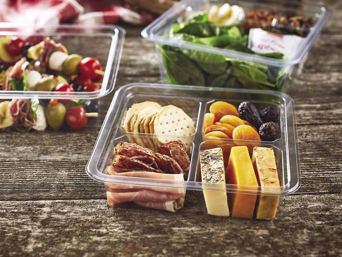 The Fresh ‘N Clear® salad container line from Placon (Booth W-24033) combines a tamper-evident (TE) feature with a minimum of 25% EcoStar® post-consumer (PCR) polyeth ylene terephthalate. Ten formats are available, including a me dium and a large footprint clamshell with a dome or flat lid to provide merchandising flexibility. SD