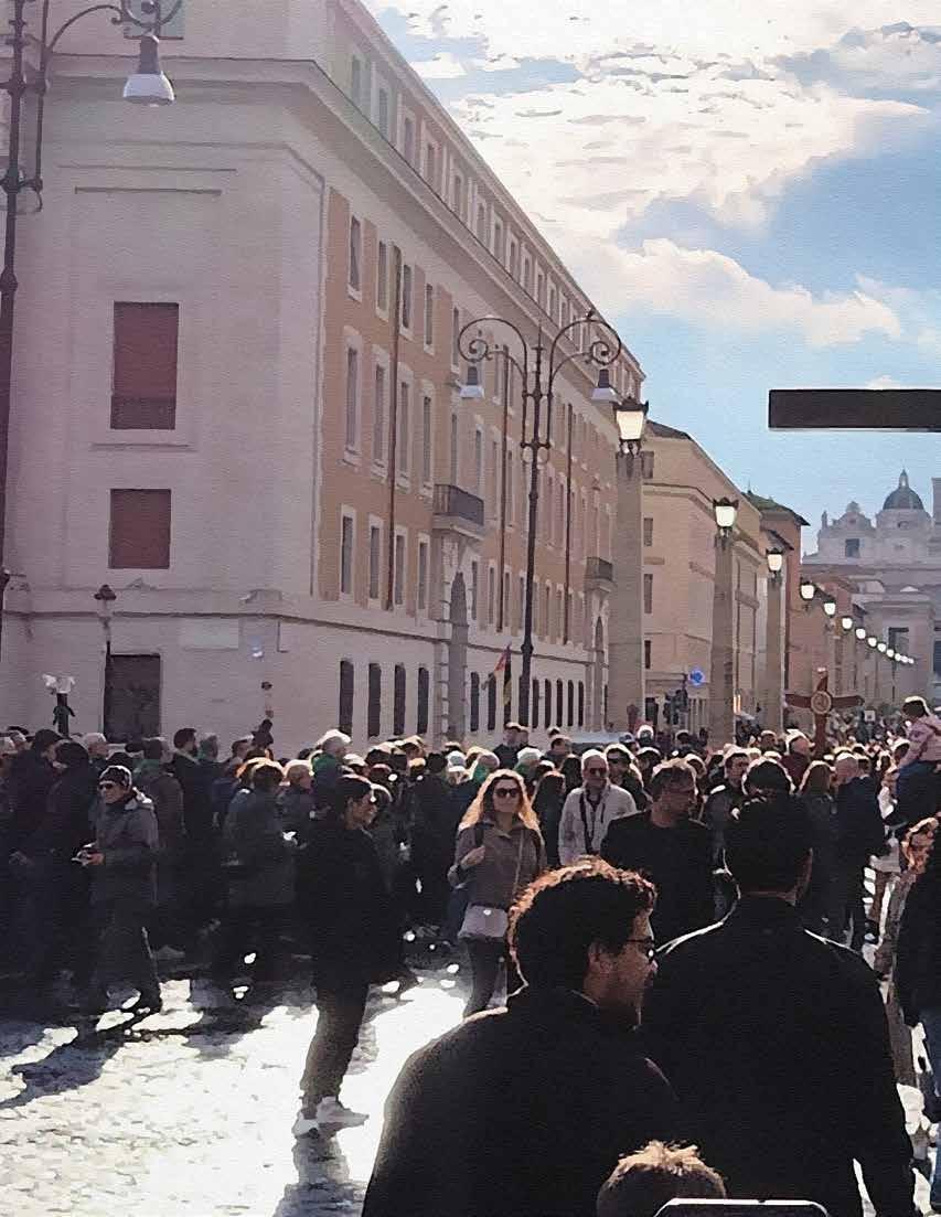 One block away from the Via della Conciliazione, I heard a loud cry coming from Saint Peter’s Square. People started running past. When I turned the corner, I could see that there was white smoke! The enthusiasm of the crowd overtook me. I made my way with saints and sinners alike within the embrace of Bernini’s colonnade. A group of seminarians invited me to wait with them for the announcement.
