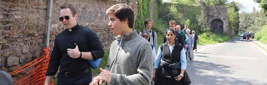 top to bottom Steven Lang '26 (St. Paul and Minneapolis) and Mauricio Romero '25 (San Angelo) eat dinner with college students who are studying abroad in Rome during the NAC's College Night; Gerard Gayou '25 (Washington) speaks with a pilgrim during the Seven Church Walk during Holy Week.