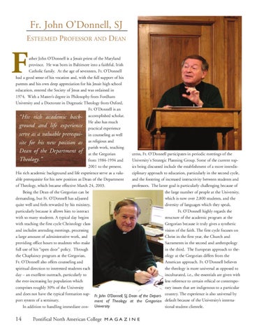 ather John O’Donnell is a Jesuit priest of the Maryland province. He was born in Baltimore into a faithful, Irish Catholic family. At the age of seventeen, Fr. O’Donnell had a good sense of his vocation and, with the full support of his parents and his own deep appreciation for his Jesuit high school education, entered the Society of Jesus and was ordained in 1974. With a Master’s degree in Philosophy from Fordham University and a Doctorate in Dogmatic Theology from Oxford, Fr. O’Donnell is an “His rich academic back- accomplished scholar. He also has much ground and life experience practical experience serve as a valuable prerequi- in counseling as well site for his new position as as religious and parish work, teaching Dean of the Department of at the Gregorian cerns, Fr. O’Donnell participates in periodic meetings of the Theology.” University's Strategic Planning Group. Some of the current topfrom 1984-1994 and ics being discussed include the establishment of a more interdis2001 to the present. ciplinary approach to education, particularly in the second cycle, His rich academic background and life experience serve as a valuand the fostering of increased interactivity between students and able prerequisite for his new position as Dean of the Department professors. The latter goal is particularly challenging because of of Theology, which became effective March 24, 2003. the large number of people at the University, Being the Dean of the Gregorian can be which is now over 2,800 students, and the demanding, but Fr. O’Donnell has adjusted diversity of languages which they speak. quite well and feels rewarded by his ministry, Fr. O’Donnell highly regards the particularly because it allows him to interact structure of the academic program at the with so many students. A typical day begins Gregorian because it truly gives a synthetic with teaching the first cycle Christology class vision of the faith. The first cycle focuses on and includes attending meetings, processing Christ in the first year, the Church and a large amount of administrative work, and Sacraments in the second and anthropology providing office hours to students who make in the third. The European approach to thefull use of his “open door” policy. Through ology at the Gregorian differs from the the Chaplaincy program at the Gregorian, American approach. Fr. O’Donnell believes Fr. O’Donnell also offers counseling and the theology is more universal as opposed to spiritual direction to interested students each inculturated, i.e., the essentials are given with day – an excellent outreach, particularly to less reference to certain ethical or contempothe ever-increasing lay population which comprises roughly 30% of the University rary issues that are indigenous to a particular and does not have the typical formation sup- Fr. John O’Donnell, SJ, Dean of the Depart- country. The experience is also universal by port system of a seminary. ment of Theology at the Gregorian default because of the University’s internaIn addition to handling immediate con- University tional student clientele.