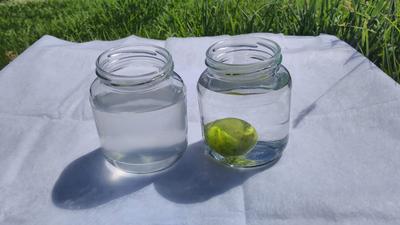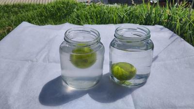 4 Finalmente coloca el otro limón en el recipiente con agua salada. ¿Qué pasa? ¡El limón flota!