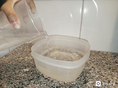 Introduce la esponja en el recipiente con agua lentamente, asegurándote de que se moje por completo