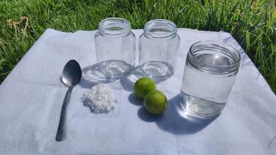 2. En uno de los recipientes, agregamos una o dos cucharadas de sal Usa la cuchara para mezclar bien hasta que la sal se disuelva completamente creando una mezcla homogénea.