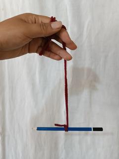 2 Diseñar una balanza didáctica y creativa. Primero se amarra un pedazo largo de lana en al mitad de un lápiz. Después se amarra otros dos pedazos cortos de lana a los extremos del lápiz. La balanza está lista para su función