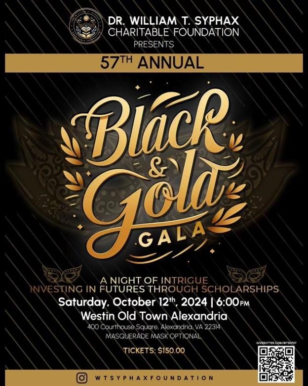 The Theta Rho Lambda Chapter of Alpha Phi Alpha Fraternity, Incorporated is hosting their 57th Annual Black & Gold Masquerade Ball. Masks are optional. It will be held on October 12th at 6pm at the Old Town Alexandria Westin. The Westin in Old Town Alexandria is located at 400 Courthouse Square, Alexandria, VA 22314. Tickets can be purchased from the code on the flyer.