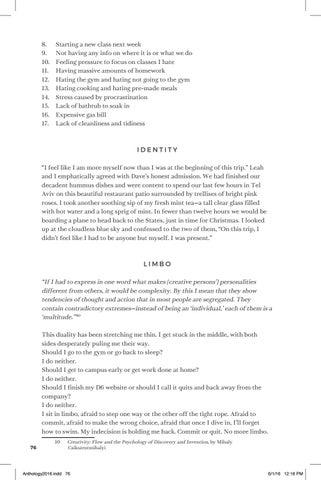 “If I had to express in one word what makes [creative persons’] personalities different from others, it would be complexity. By this I mean that they show tendencies of thought and action that in most people are segregated. They contain contradictory extremes—instead of being an ‘individual,’ each of them is a ‘multitude.’”10 This duality has been stretching me thin. I get stuck in the middle, with both sides desperately puling me their way. Should I go to the gym or go back to sleep? I do neither. Should I get to campus early or get work done at home? I do neither. Should I finish my D6 website or should I call it quits and back away from the company? I do neither. I sit in limbo, afraid to step one way or the other off the tight rope. Afraid to commit, afraid to make the wrong choice, afraid that once I dive in, I’ll forget how to swim. My indecision is holding me back. Commit or quit. No more limbo. 76